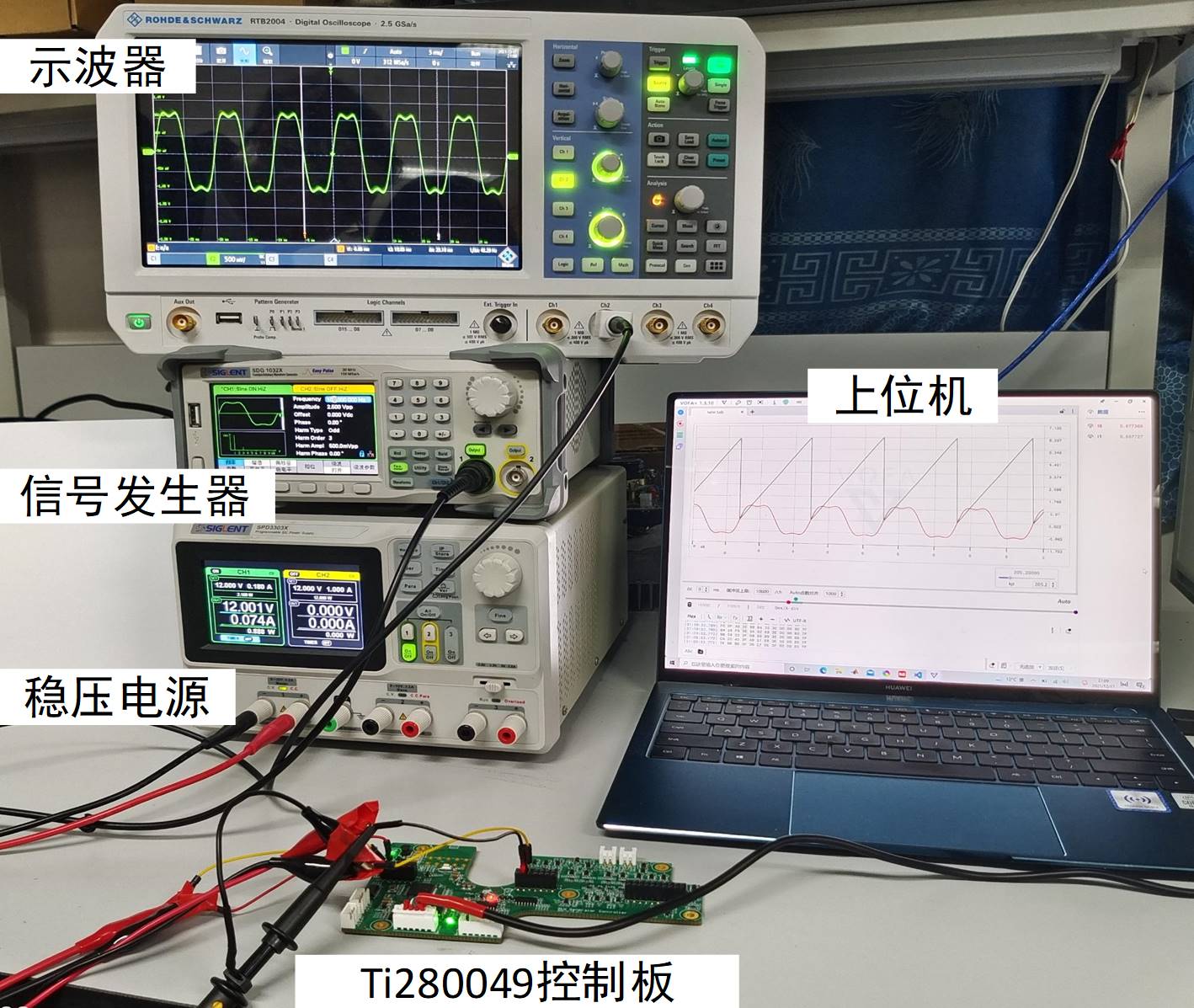 所设计的数字锁相环实验平台如图7所示,其由示波器、信号发生器、稳压电源、控制板和上位机组成,可以满足教学演示和创新训练的需求。首先,由稳压电源给控制板供电;然后,信号发生器产生频率可变、谐波可调的输入信号;其次,由搭载信号调理电路和TMS320F280049芯片的控制板采集输入信号,经数字锁相环程序运算后得出输入信号的相位信息[15];最后,由控制板将采集到的输入信号和锁相得到的相位信息通过串口发送给上位机显示,可直观锁相结果。其中,示波器可用于观测数字锁相环输入信号是否设置准确。