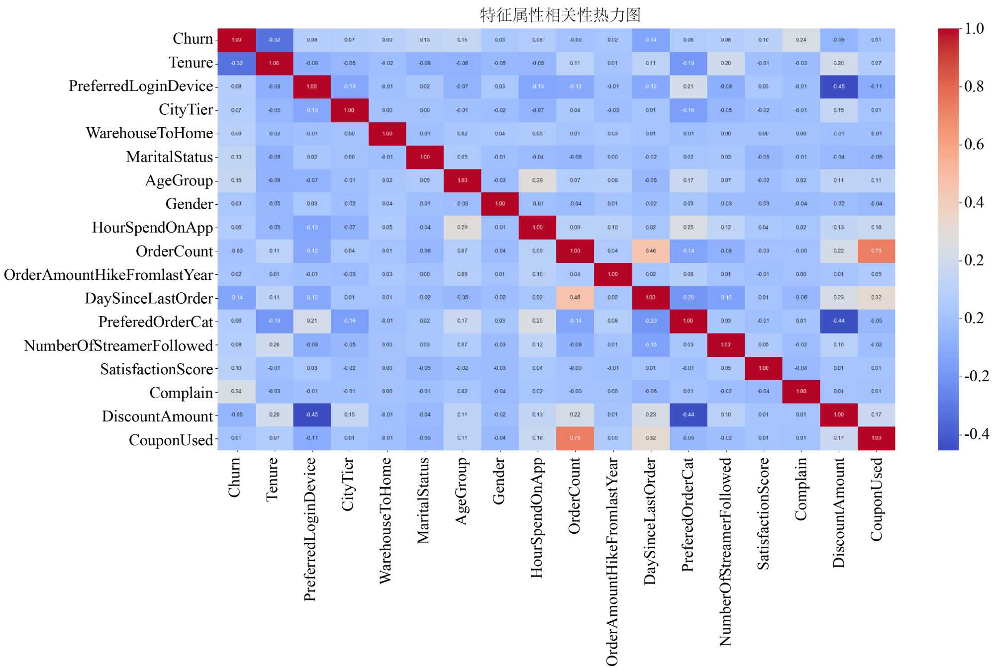 为了探究各变量与用户流失之间的关系,本文绘制了变量相关性热力图。从图2可以看出,部分变量与用户流失具有较强的线性相关性,其中在平台注册时长与用户流失呈显著负相关(r = −0.33),表明用户使用时间越长,流失可能性越低;投诉次数与用户流失呈正相关(r = 0.25),提示投诉多的用户更易流失;此外,满意度得分也与用户流失负相关(r = −0.20),说明满意度较高的用户更可能留存。与此同时,相关性分析还发现部分特征之间存在较强的共线性,例如用户累计下的订单数量与优惠券使用的相关系数高达0.75,提示二者可能存在信息冗余。因此,在后续建模中,为避免多重共线性带来的干扰,本文优先保留与用户流失相关性较高的变量,并对高度相关的变量对进行合并或剔除,从而提升模型稳定性与解释性。