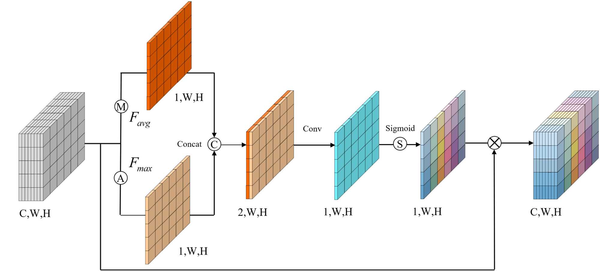 空间注意力模块的整体架构如图2所示。具体来说,空间注意力机制利用特征图中的空间关系生成空间注意力,使得模型能够集中关注特征图中的显著信息。首先,