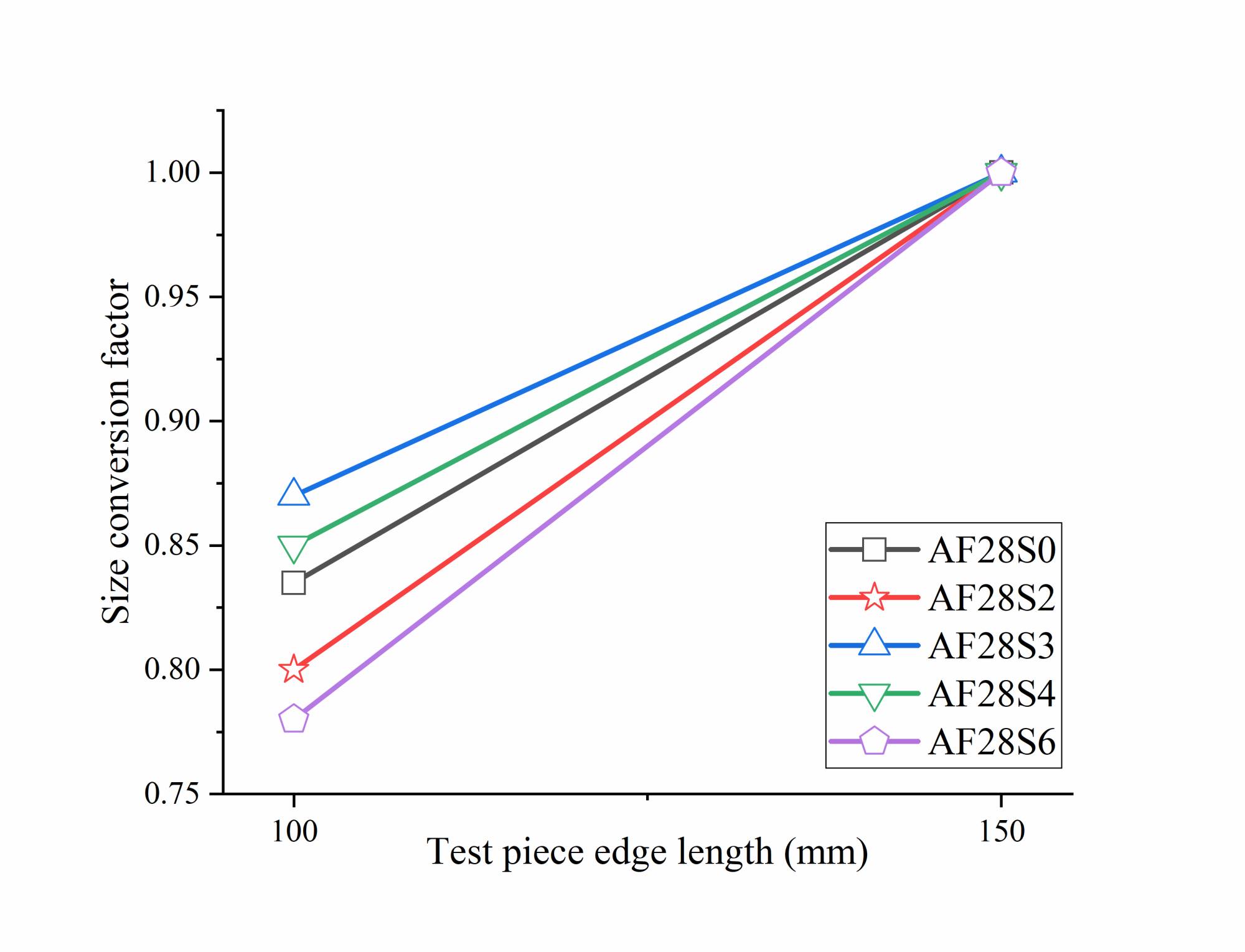 尺寸换算系数β用于量化150 mm与100 mm立方体试件的力学性能差异,实现非基准强度向基准值的转换(GB/T 50081-2019)。如公式(1)所示,该系数以150 mm试件抗压强度为基准定义。