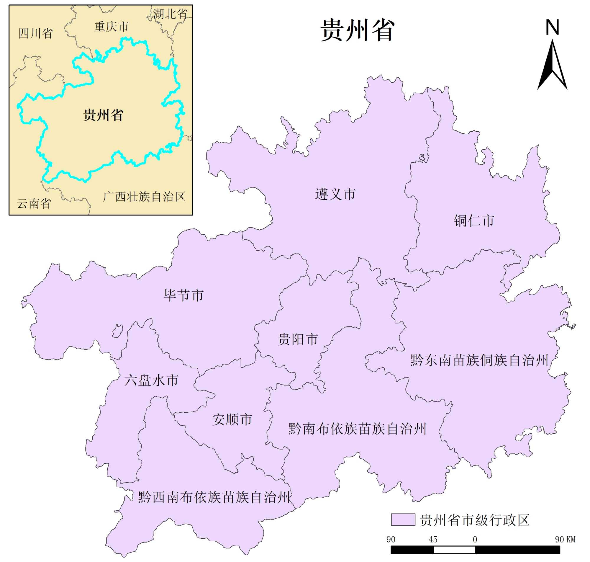 如图1所示,研究区地理位置介于东经103˚36′E~109˚35′E、24˚37′N~29˚13′N之间,北与川渝相邻,东与湘相邻、南与桂相邻、西与云相接。省会为贵阳市,全省分为九个地区,贵州省作为西南的经济、交通要地,地理位置上有着重要意义。地处云贵高原,地形以山地为主,地貌丰富多样,喀斯特地貌发育显著,地势自西向东降低,西高东低。气候上属于亚热带季风气候,地处低纬度偏北地带,加上受地形和海拔,亚热带季风气候特征相对不明显,但全年也温和多雨湿润,只是相对于东部同纬度气候特征较弱。生态植被上,贵州有着丰富森林资源,森林覆盖率高达百分之四十,空气质量一直保持在全国前列,造就出环境优美,空气清新的青山绿水的贵州。在水文水系上,贵州省河流众多,水系发达,水资源丰富,主要分为八大水系,是长江流域和珠江流域的重要组成部分,对两大流域的上游生态保护发挥重大作用,水系顺地势由西部、中部向北、东、南三面分流,地表径流稳定。