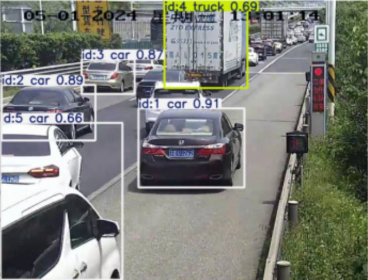 本研究收集了高速公路路段的九个视频数据,从中提取出上万条车辆数据,使用cv2.VideoCapture进行提取视频帧,将视频逐帧读取为图像格式,通过循环读取视频的每一帧,将其转化为可处理的图像数据结构,如图1所示,以便进一步分析和处理。为了便于后续分析,根据时间对车流量进行时间段划分,以统计不同时间段内的交通流参数。在数据处理过程中,首先对视频数据进行预处理,包括灰度转换、高斯模糊、边缘检测等操作,以提取车道线信息,确定每个像素代表的实际距离。然后,通过yolov8实现车辆检测和跟踪算法,如图2所示获取不同帧中车辆的边界框中心位置,计算车辆移动的实际距离,进而得出车流速度、流量等参数值。