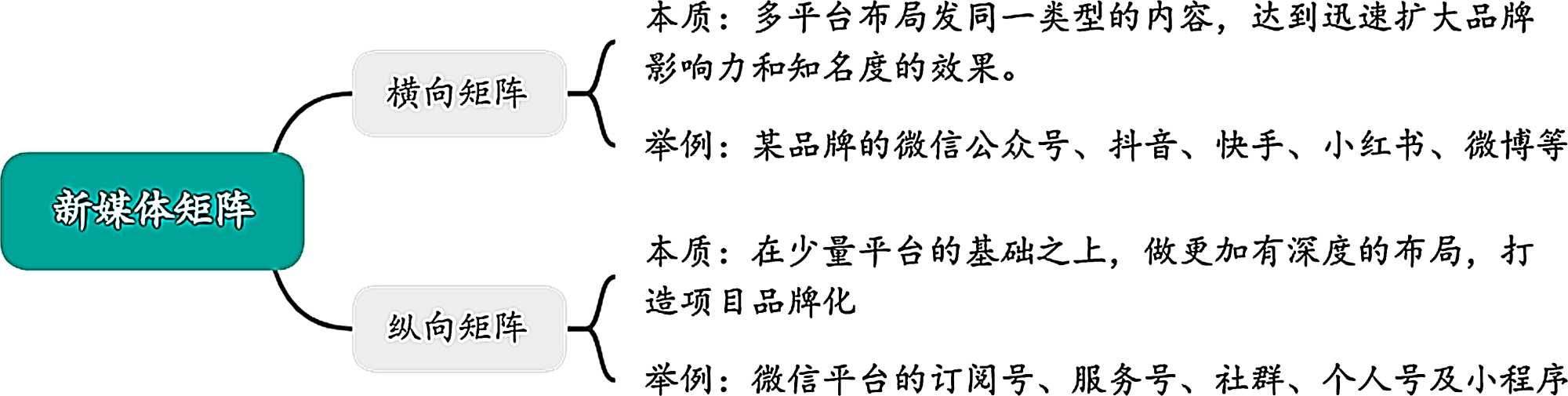 新媒体矩阵是指品牌或者企业通过多个新媒体平台建立起的相互关联、协同运作的媒体网络,是能够触达目标群体的多种新媒体渠道组合。它分为横向矩阵和纵向矩阵(如图1所示)。横向矩阵的本质多平台布局发同一类型的内容,达到迅速扩大品牌影响力和知名度的效果。例如:某品牌的微信公众号、抖音、快手、小红书、微博等;纵向矩阵的本质是在少量平台的基础之上,做更加有深度的布局,打造项目品牌化,如微信平台的订阅号、服务号、社群、个人号及小程序等。如在同一个平台起不同的账号,或者在不同的端口发布等等,纵向新媒体矩阵可以加强品牌在细分领域内的垂直程度,以带来更好的宣传效果。