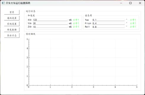 天车大车运行状态是工业设备监测中的关键指标,其异常状态的可视化呈现与后期数据分析具有重要价值。上位机采用Qt Widgets框架进行开发,主要包含界面展示与数据处理两大模块。UI设计涵盖运行日期、三轴加速度与姿态角的实时显示,并在检测到轨道偏斜或异常振动等情况时触发即时报警。系统运行过程中产生的异常信息将通过日志模块本地存储,为后续阶段性的运行状态分析提供有力支撑。