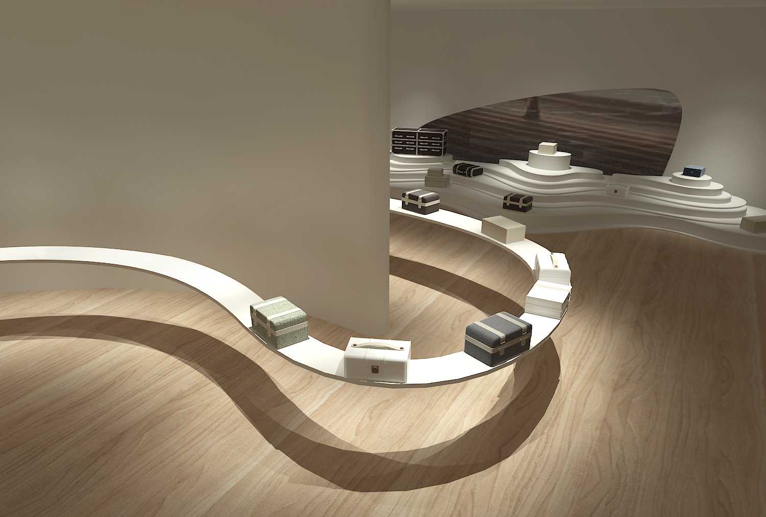 本研究中弧形展台都是形象统一化风格,整个展厅的内部造型需要流线型的自然形态,以符合“简洁、纯朴、环保”的理念,色彩也要淡雅,需要大量的留白(见图3)。因此展具的颜色均为纯白。贯穿展厅的弧形展台造型独特,能体现出鲜明的个性,统一整个展览的风格。高低不一的圆形展台和等高线形展台按重复但有节奏地安置在主体弧形展台与墙体之间,加强流动的自由感,能丰富整体的效果,形成富有节奏和韵律的变化,给观者带来视觉美感的同时,还能创造一定的展示价值。