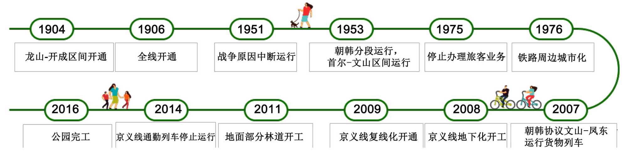 京义线铁路始建于1905年日本殖民统治朝鲜半岛时期,这条连接当时京城(今韩国首尔)与朝鲜新义州的战略通道,是日本军国主义企图全面控制朝鲜半岛并掠夺中国东北资源的重要工具。随着2006年首尔铁路地下化工程的推进,京义线地上段完成历史使命而废弃。2007年,韩国铁路建设工团与麻浦区政府达成土地置换协议,至2009年成功实现地上段公园化改造的初步目标,如下图1京义线功能性转变过程。