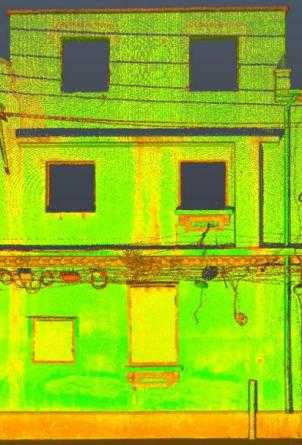 由于砖木结构整体性较差,抗震能力薄弱,因此房屋平移后的比对工作尤为重要。基于两次的点云模型,分段将各个立面逐一截取出来,为了更好的显现损伤细节,使用带强度点云进行比对,平移前后的局部立面点云数据分别见图5、图6所示。比对结果表明,平移后外立面存在多处墙体破损、开裂、粉刷脱落、砖面破损等损伤状况,将立面点云导入CAD中,对各类型损伤进行分类注释,对损伤的长度、走向、范围进行1:1的描绘,整理后为后续施工修补及统计工作量提供依据。