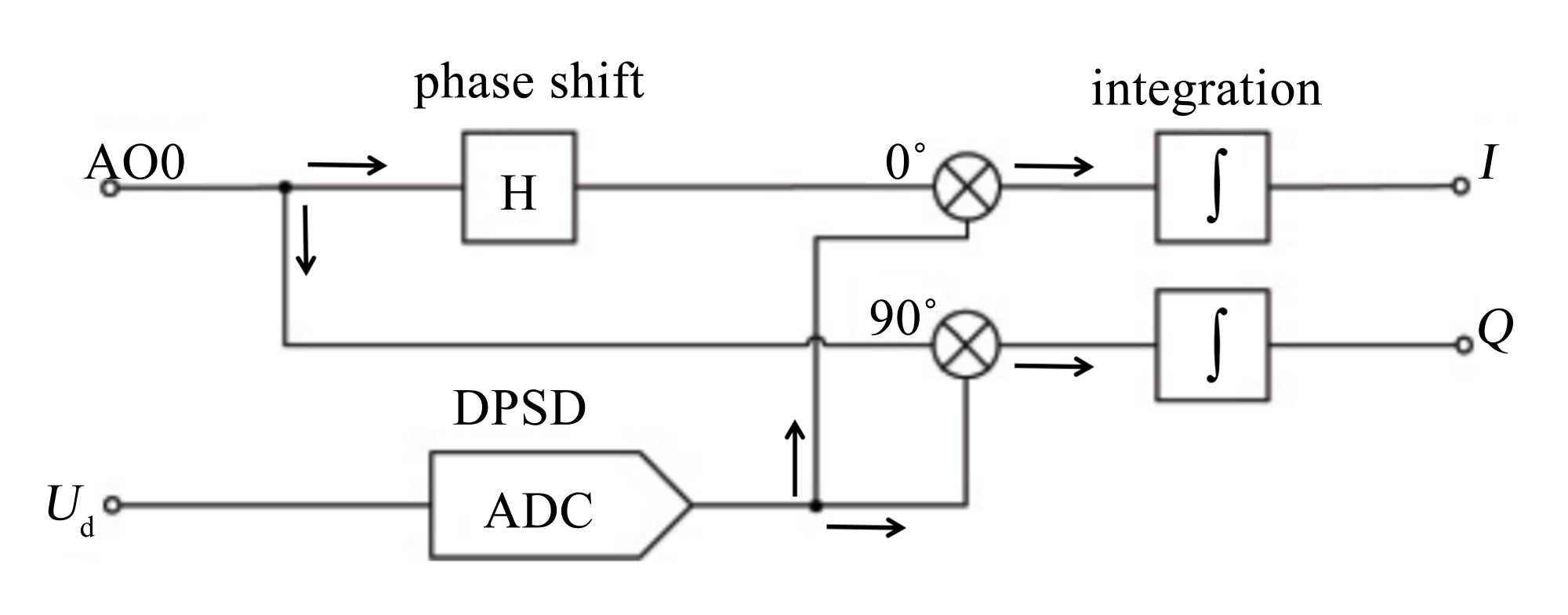 如图4所示,将信号源AO0生成的参考信号通过希尔伯特变换相移90˚,原信号为Uref1,移相后的信号为Uref2,将两路信号分别与采样得到的电压误差信号Ud相乘,并通过积分来消除高频项。此方法以Uref1和Uref2组成的一组基向量作为参考,对Ud进行分解,两分量分别记为I和Q,再通过坐标转换,将Ud的基向量转换到原向量空间,即可计算出Ud的幅值和相位。