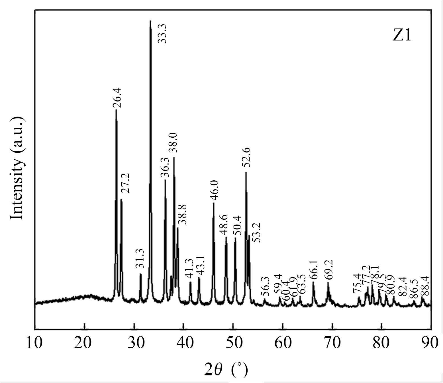 图7(b)贝壳粉查阅资料得到文石2θ角度值:常见于26.4˚、27.2˚、31.4˚、33.3˚等位置出现较强衍射峰[17]。对应的矿物为文石相碳酸钙。文石是碳酸钙的一种同质多象变体,属于斜方晶系,晶体结构中Ca2+和CO32−排列方式决定其X射线衍射特征峰位置。方解石2θ角度值:典型强衍射峰在2θ约23.2˚、29.6˚、39.6˚、43.2˚、47.7˚等位置[18] [19]。对应的矿物为方解石相碳酸钙。方解石属三方晶系,其特殊晶体结构使其具有独特的X射线衍射峰特征。