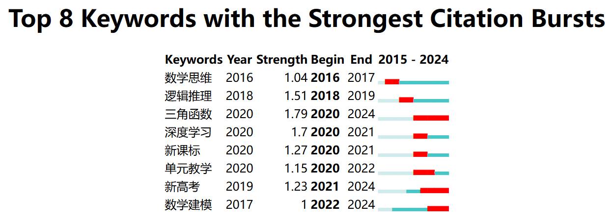 Figure 7. Burst detection map of keywords in literature on key competencies in high school mathematics