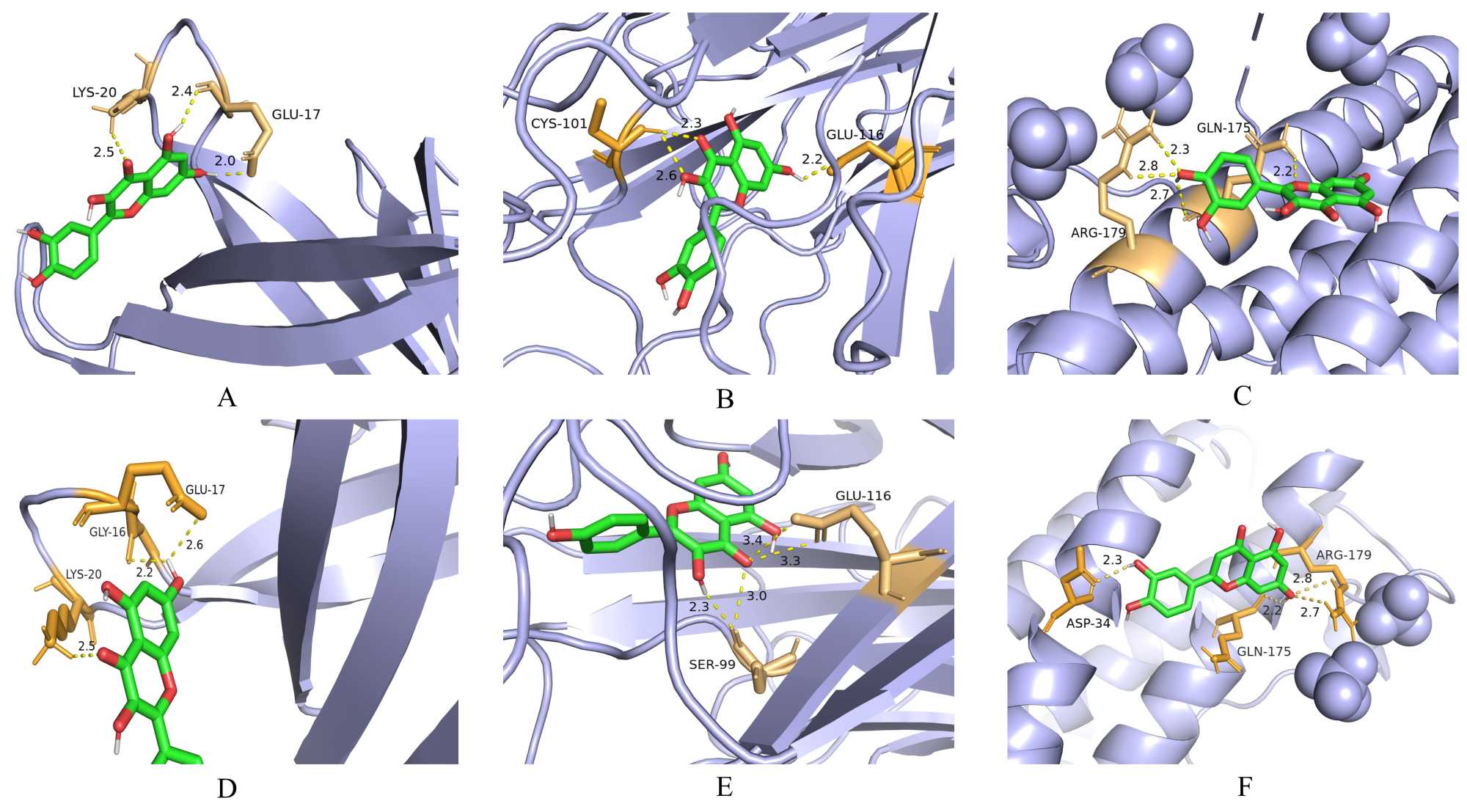 Figure 6. (A) Quercetin-AKT1 docking result; (B) Quercetin-TNF docking result; (C) Quercetin-IL-6; docking result (D) Kaempferol-AKT1 docking result; (E) Kaempferol-TNF docking result; (F) Luteolin-IL-6 docking result