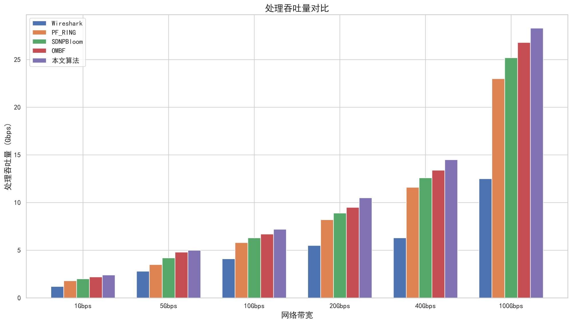 (3) 处理吞吐量:在10 Gbps网络带宽下,本文算法的处理吞吐量为7.2 Gbps,相比Wireshark (4.1 Gbps)、PF_RING (5.8 Gbps)、SDNPBloom (6.3 Gbps)和O MB F (6.7 Gbps),分别提升了75.6%、24.1%、14.3%和7.5%。在更高网络带宽下,本文算法的优势更加明显,能够更好地适应高速网络环境下的流量处理需求。处理吞吐量对比结果,如图9所示。