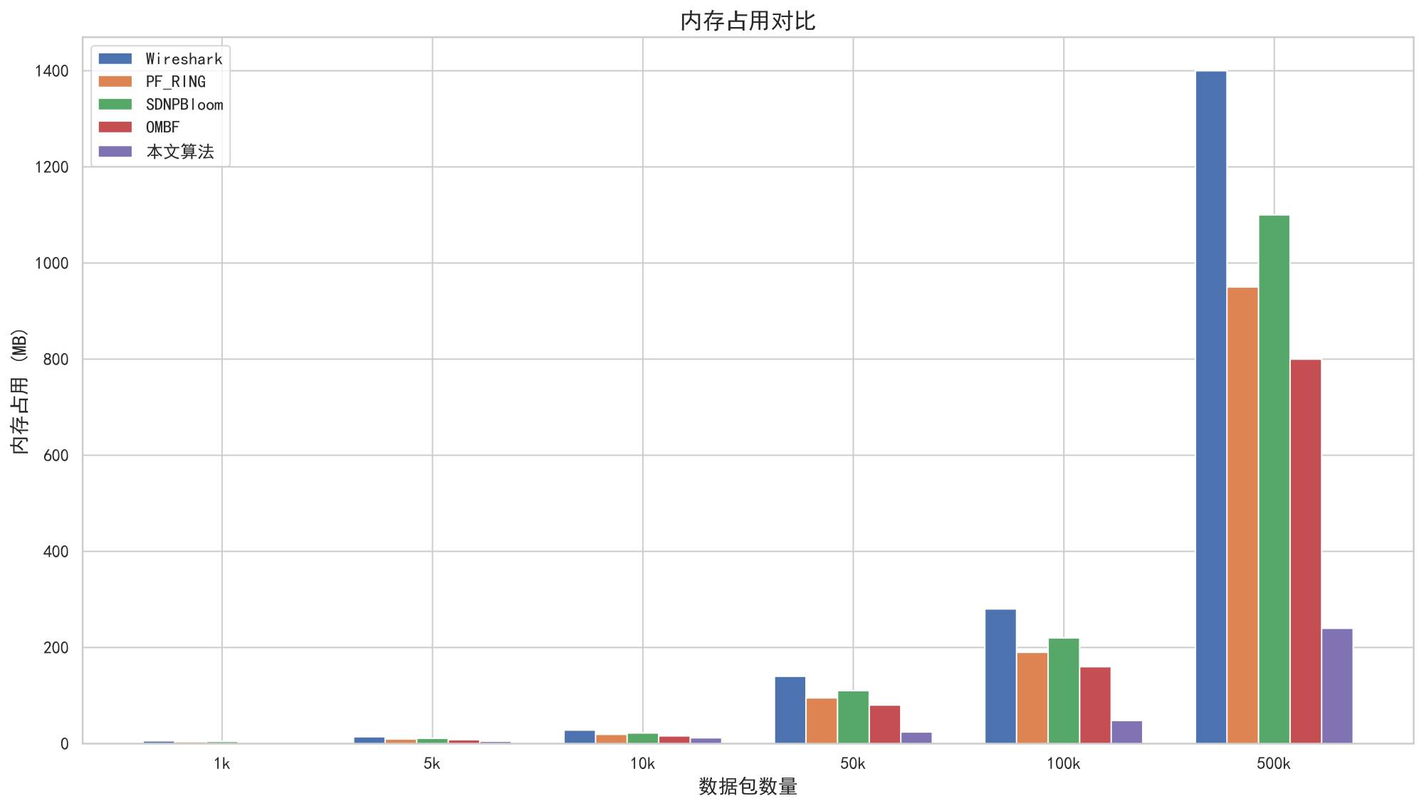 (4) 内存占用:在处理10 k数据包时,本文算法的内存占用为12 MB,相比Wireshark (28 MB)、PF_RING (19 MB)、SDNPBloom (22 MB)和O MB F (16 MB),分别降低了57.1%、36.8%、45.5%和25.0%。随着数据包数量的增加,本文算法的内存占用增长趋势也较为平缓,有效控制了内存资源的消耗。内存占用对比结果,如图10所示。