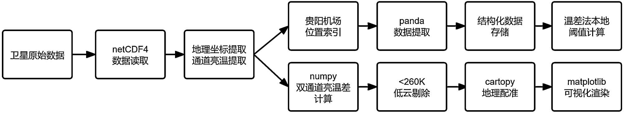 综上所述,数据处理的流程如图1所示。采用netCDF4库作为数据读取引擎,从.nc文件中提取经纬度网格、红外通道亮温数据等科学数据集;cartopy库是地理空间处理核心,提供地图投影系统、行政区划边界加载、经纬度网格配置及坐标转换功能,确保数据在地理坐标系中准确定位;pandas库是结构化数据处理核心,提取贵阳机场上空的亮温差并存储表和形式便于后续阈值分析;numpy库是雾识别算法核心,通过计算亮温差并进行低云剔除,得到雾区数据组;matplotlib是可视化呈现框架,执行渲染红外云图底图与雾区识别图层等可视化任务。