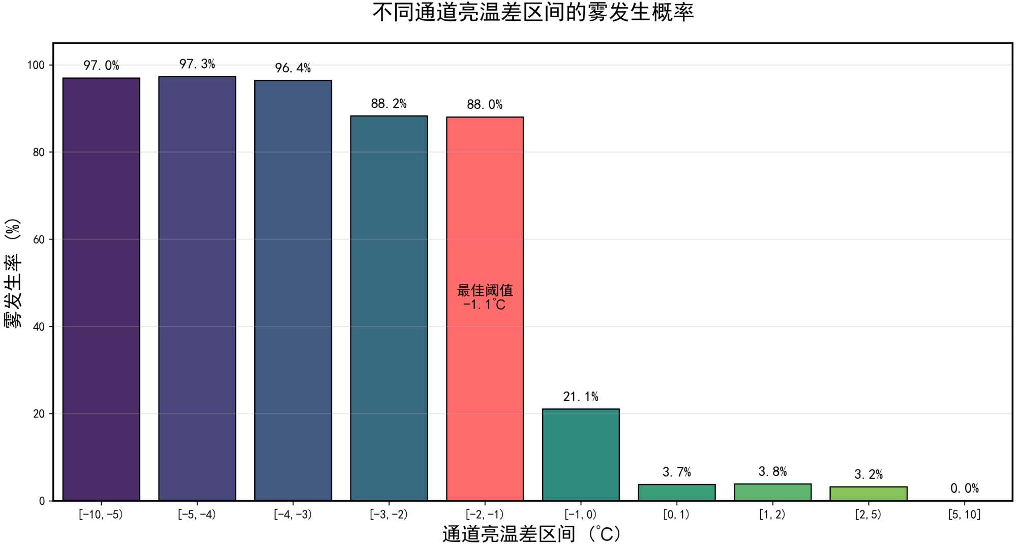为验证雾识别起始阈值的有效性,将通道亮温差从−10℃至10℃之间划分为10个阈值分区,统计每个阈值分区的雾出现概率,结果如图5所示。可以看出通道亮温差与雾天气过程发生与否之间的定量关系:通道亮温差在[−10, −5)区间时,雾发生率为97.0%;通道亮温差在[−5, −4)区间时,雾发生率为97.3%;通道亮温差在[−4, −3)区间时,雾发生率为96.4%;通道亮温差在[−3, −2)区间时,雾发生率为88.2%;通道亮温差在[−2, −1)区间时,雾发生率为88.0%;通道亮温差在[−1, 0)区间时,雾发生率降低至21.1%;当通道亮温差 > 0℃时,雾发生率仅为10.7%,且主要出现在能见度接近1000米的临界状态,有效验证了−1.1℃最佳阈值的有效性。