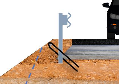 (1) 当高速公路边坡高度超过5 m时,为防止削坡过程中原有波形护栏发生倾倒,需在削坡前对其进行加固,加固施工示意图如图3所示。具体措施为:先在波形护栏外侧的土路肩处按1:1.5的坡比向下放坡至路面以下1.2 m处;随后,在对应每个波形护栏立柱的位置使用U型钢筋进行加固。