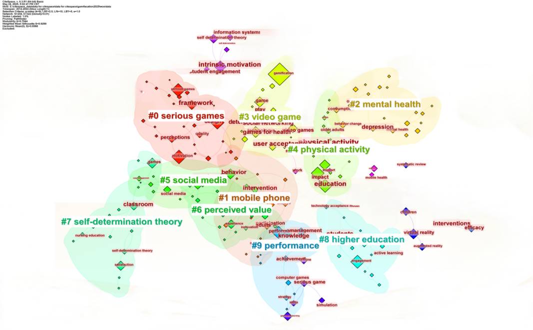 #游戏化与学习成效:该聚类是最为稳定和广泛的研究方向,代表关键词包括learning outcomes (学习成果)、interactive learning environments (交互式学习环境)、game-based learning (基于游戏的学习)等。这些关键词突显了游戏化在课堂教学、学习动机激发、认知建构与教育评估等场景中的深度应用。研究者普遍关注游戏机制如何提升学习者参与度与学习效果,该方向逐步从概念验证向实证路径拓展,构成国际游戏化研究的主干。
