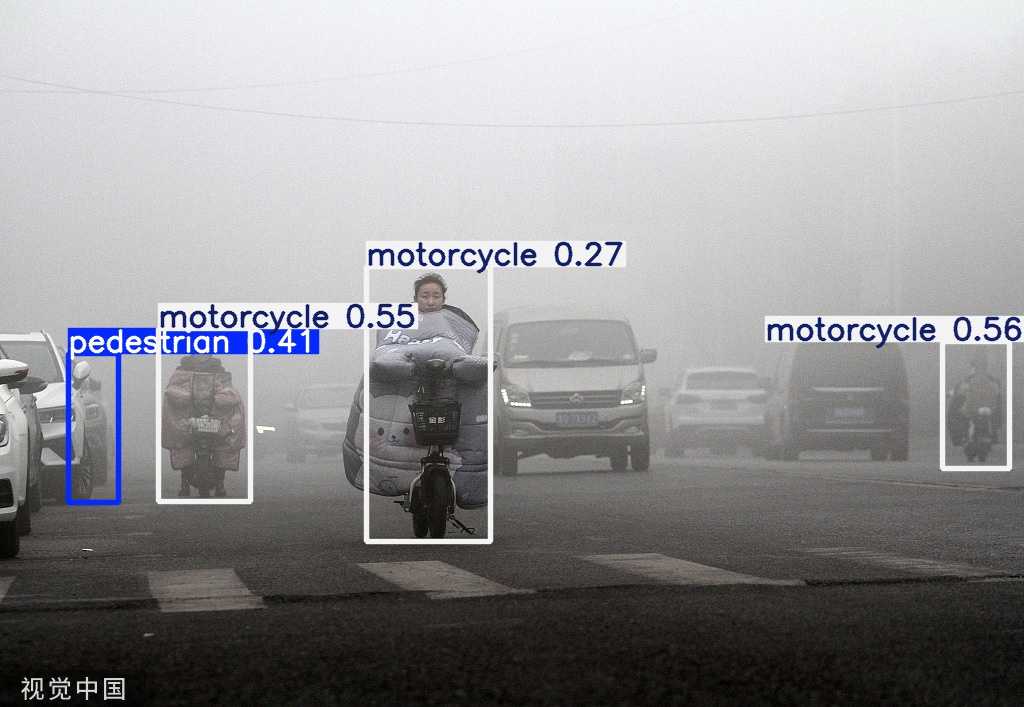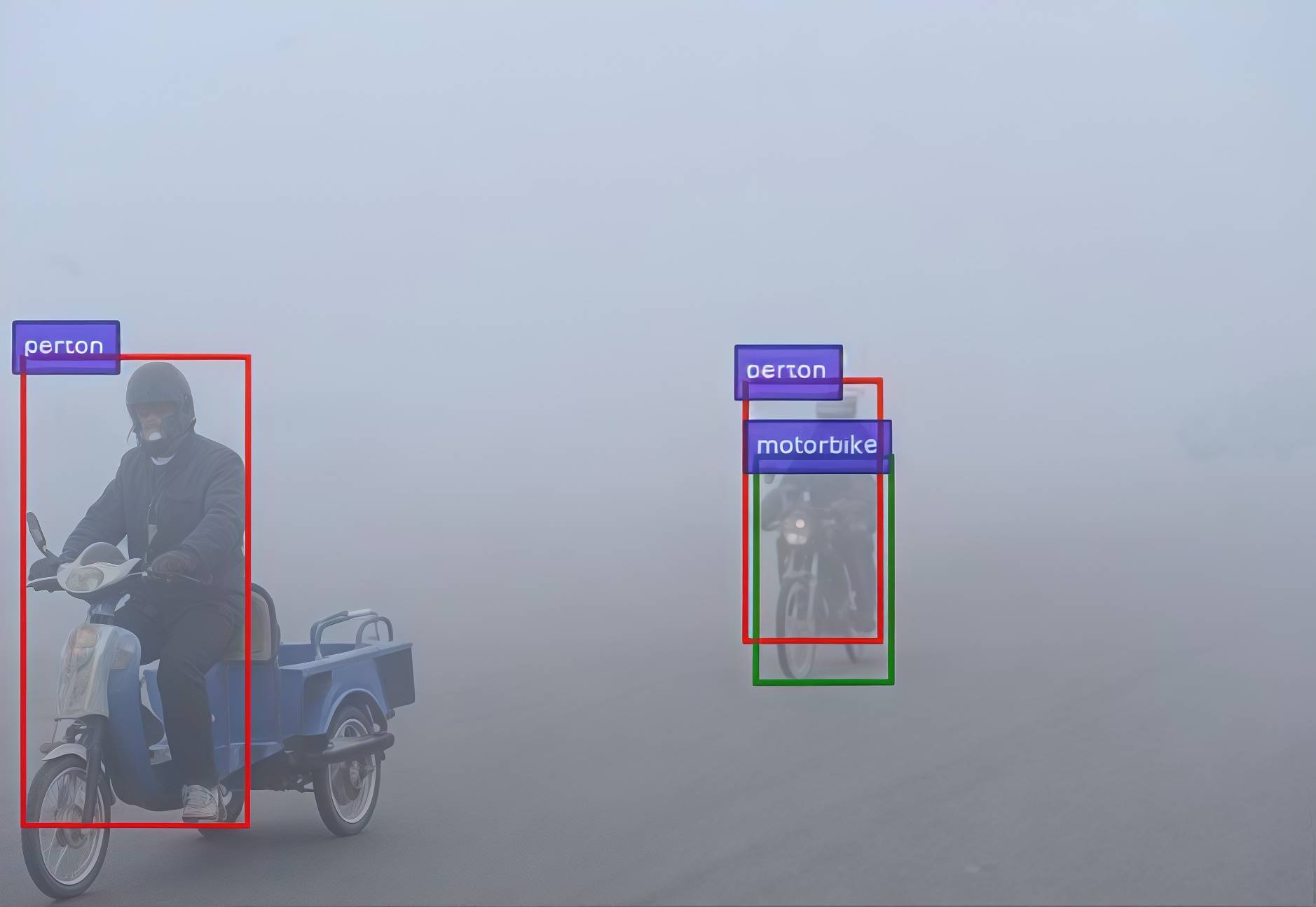 在本研究中,我们观察到数据集中摩托车、电动车和自行车的分类存在显著争议。即便在清晰图像中,这些目标的类别界限模糊,难以准确区分。如图4所示,在雨雾天气条件下,由于图像质量下降、目标特征模糊,这一问题进一步加剧。如图5所示,通过初次标注后的模型预测分析,我们发现这些类别之间存在较高的误检率,严重影响了检测结果的准确性。