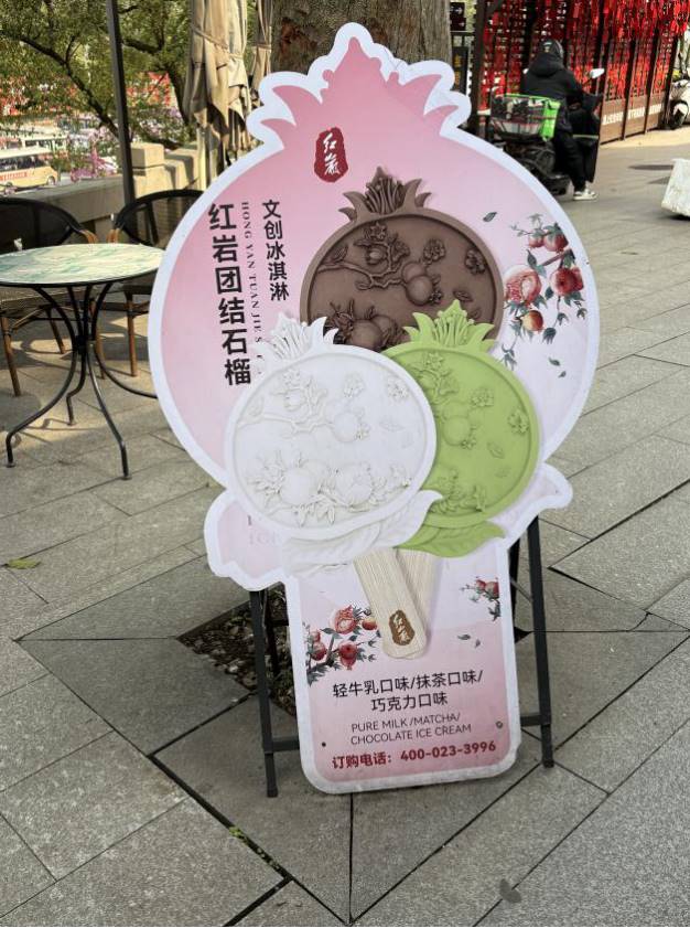 红色语言景观传递了“继往开来的使命与担当”这一现代转化后的情感价值,体现了革命精神如何在消费社会与公共空间中以更新颖、生活化的方式得以延续与传播。该情感不再局限于对历史的纪念,而是强调对红色文化在当下社会语境中创新表达与自觉传承的积极响应。从社会符号学角度看,视觉语法中的“象征组合”“色彩隐喻”与“文化编码”使得这种日常场景中的红色意象既具审美功能,又承载价值导向。如图6所示,这款文创冰淇淋将石榴意象与红岩精神结合,采用对称排布与果形浮雕设计,将传统视觉符号植入现代商品中。广告牌整体呈现粉色与红棕为主的温暖色调,搭配绿色与白色冰淇淋的视觉反差,营造出亲和、愉悦的情绪场,弱化了“红色”所带来的政治张力,增强了文化亲近感。广告文案中“红岩团结石榴”作为情感标签,既点明精神核心,也赋予产品叙事张力,使得消费者在日常消费中完成对红色文化的自发接触与认知重塑。因此,红色语言景观通过商业视觉表达的方式,拓展了其文化传播的边界,使革命精神在新时代中以更柔性、可感的方式持续影响公众认知,实现情感传承的日常化与生活化。