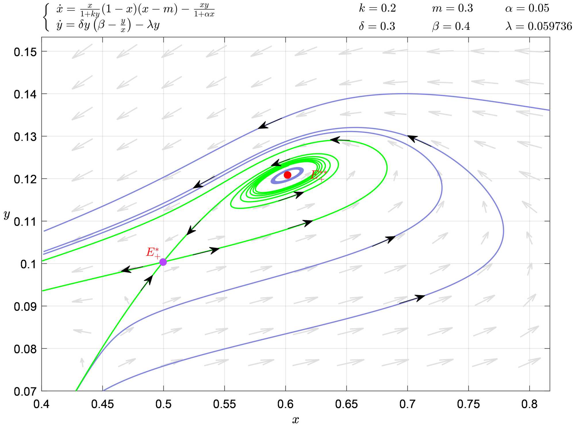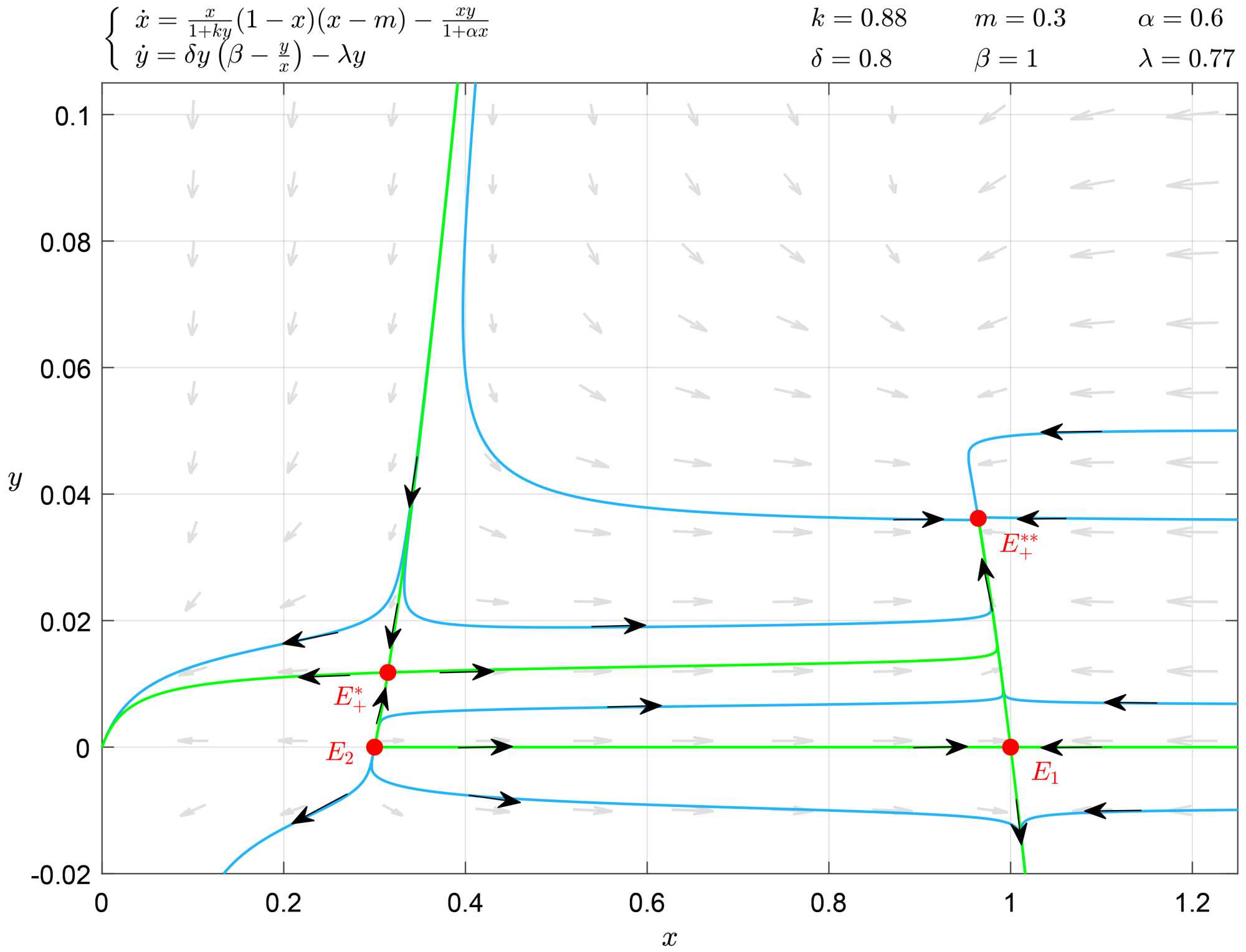 通过观察图4可知,模型(5)发生了一次鞍结分岔,可以产生一个稳定的内平衡点,这暗示了捕食者种群与食饵种群可以形成一个常稳态生长共存模式。因此,从图3和图4可知,由控制参数取值所诱发的模型(5)跨临界分岔与鞍结分岔是导致种群生长共存模式形成的内在驱动机制之一。