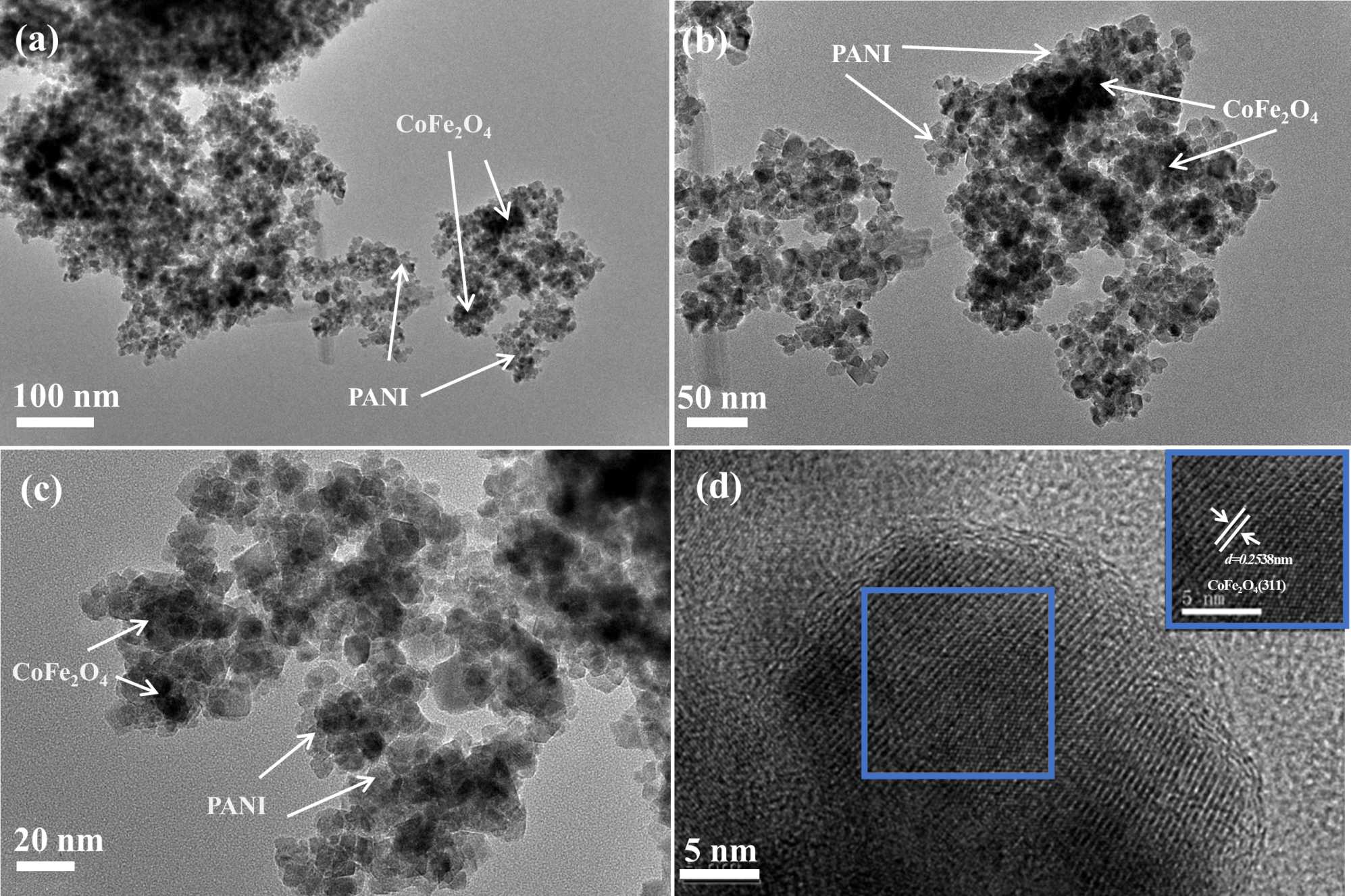Figure 3. (a)~(c) TEM images of CoFe2O4@PANI at three different magnifications, respectively, (d) HR-TEM image of CoFe2O4@PANI