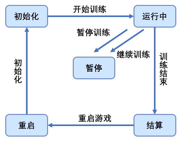 系统主控制逻辑由五个核心部分构成,分别为:游戏状态管理、UI反馈管理、目标物体交互检测、切割效果管理(粒子系统)以及音效与提示模块。通过C#脚本实现并在Unity引擎中按模块化架构进行调度与协同工作。游戏状态管理主要负责训练流程的生命周期控制,包括初始化、运行中、暂停、结算和重启等状态的管理。如图7,系统采用状态机模式(State Machine),确保不同状态间的转换稳定,并通过事件机制触发各模块联动响应。