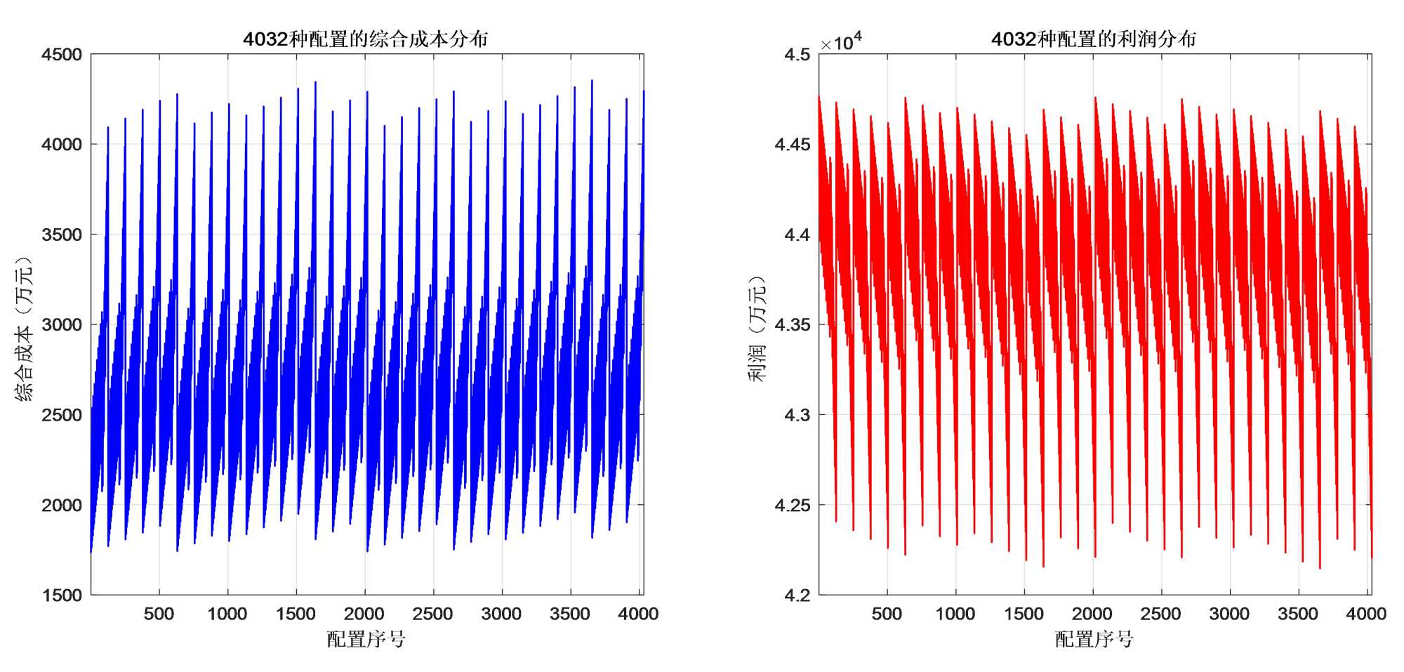 由于是两条生产线则所有的配置种类共为8640种,而通过排除满足产能和客户满意度的设备配置共有4032种,其中最优配置的利润与综合成本的示意图如图3与图4所示。