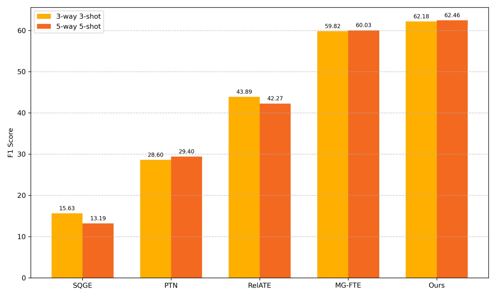 表3展示了不同方法在FewDuIE2.0数据集上的实验结果。由于FewDuIE2.0的数据结构更为复杂且包含更多样化的语言现象,因此对模型的建模能力提出了更高的要求。尽管如此,本文提出的方法仍然在3-way-3-shot和5-way-5-shot任务中均表现出色,在两个任务中分别达到62.18%和62.46%的F1分数,同样超越所有对比方法。其中,与MG-FTE [6]相比,F1分数分别提升了2.36%和2.43%,显示出所提方法在面对更复杂语义结构时依然具备良好的泛化能力和稳定性。从图3的F1性能对比柱状图中可以看出,本文方法在FewDuIE2.0数据集上依然保持领先,充分说明其在复杂任务中的适应性与鲁棒性。