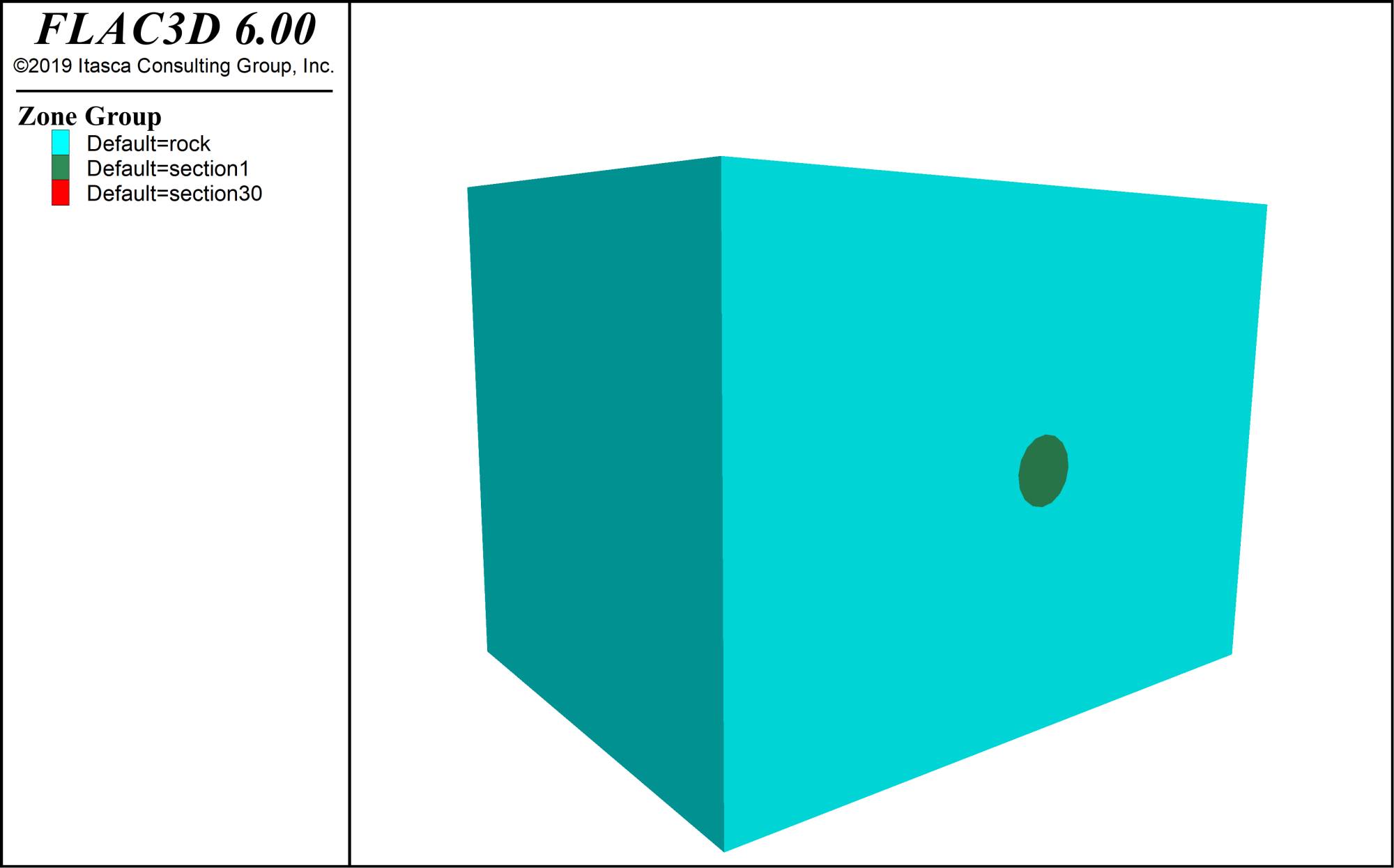 本文以埋深为15米长的浅埋段隧道为研究对象,其穿越的地质条件为典型的Ⅴ级破碎带,隧道设计为直径4米的圆形断面,总长30米。建立宽20米(取3至5倍洞径以确保边界效应最小)、高30米的三维数值模型,模拟区域覆盖了30米厚的强风化砂岩围岩。隧道支护方案采用初期支护与系统锚杆相结合:初支为10厘米厚的C20喷射混凝土层;锚杆选用C22钢筋,长4.5米(其中深入岩体有效锚固段约4.4米),以间距2米呈梅花型布置于拱顶及侧壁。在数值分析中,强风化砂岩围岩采用能反映其剪切破坏特性的摩尔–库伦本构模型进行模拟;考虑到衬砌(喷射混凝土)材料强度较高且预期破坏风险较低,采用线弹性模型简化处理;锚杆则通过植入式桁架模型来模拟其对围岩的加固作用。研究采用全断面一次开挖的方式进行施工过程模拟。全断面开挖方法三维计算模型如图2所示。