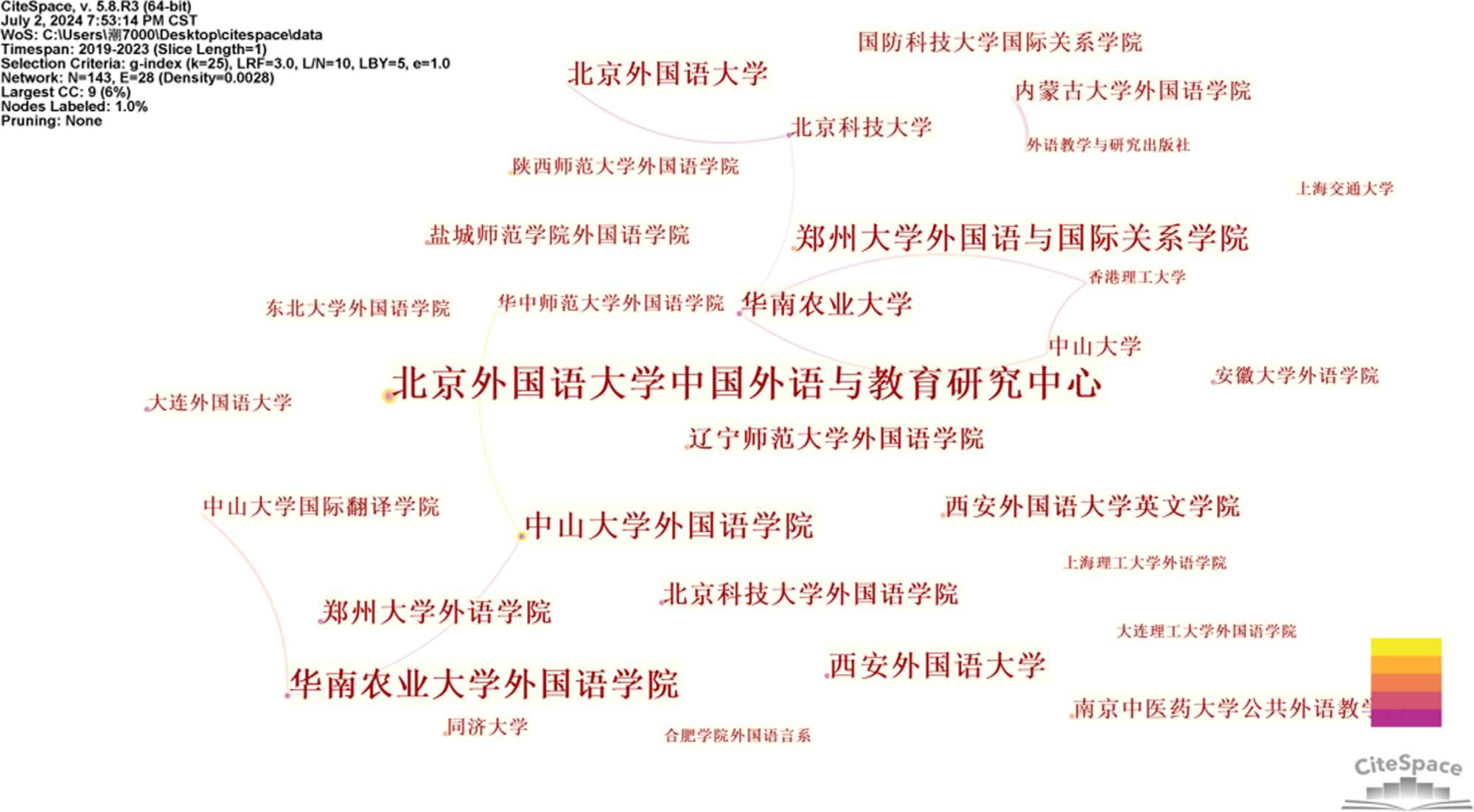 根据得出的数据分析,国内系统语言学研究主要集中在各个大学的外国语学院中。采用与关键词图谱分析相同的手段,在中国知网中收集数据,将数据信息以Refworks格式导入CiteSpace,勾选类型中的机构(Institution)进行可视化分析,得到的合作机构有北京外国语大学、华南农业大学、西安外国语大学、郑州大学、北京科技大学和中山大学等。