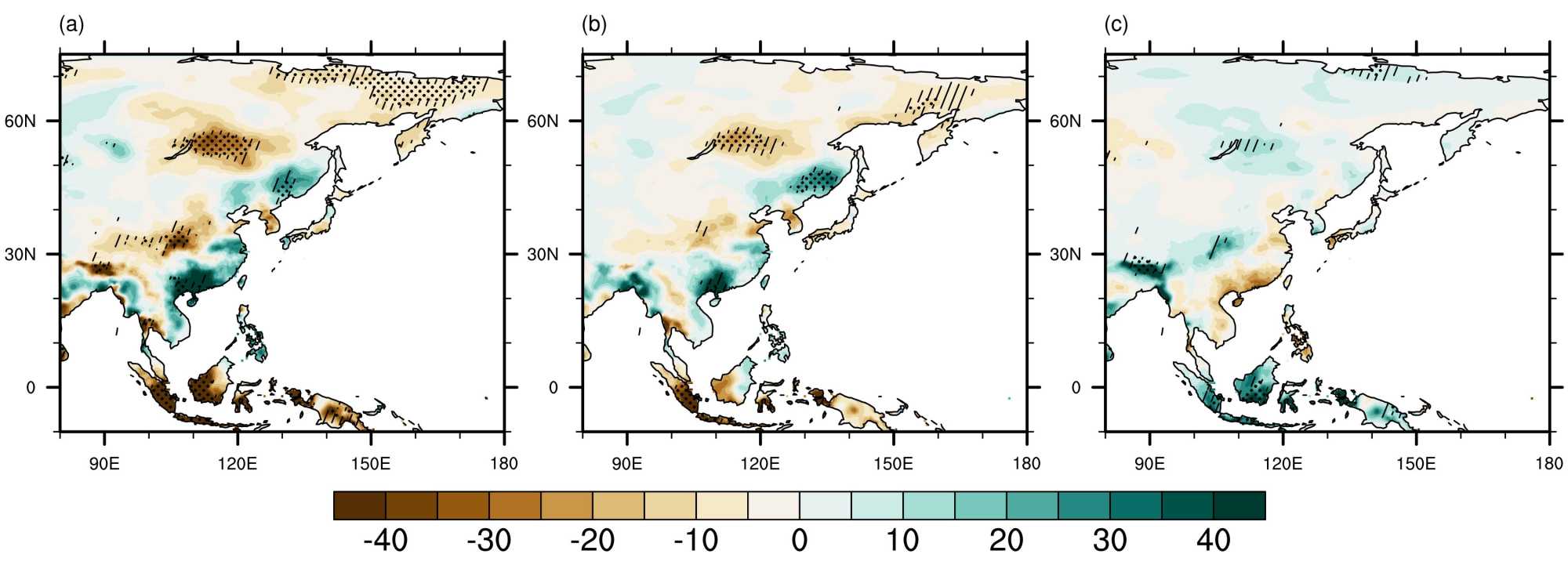 图2. (a) 1980~2020年夏季海温偏暖年份与偏冷年份降水差值场;(b)/(c)分别为海温偏暖/冷年份与1980~2020年气候态降水差值场(单位:mm month−1)。打点/斜杠阴影部分表示合成结果通过95/90%的置信水平