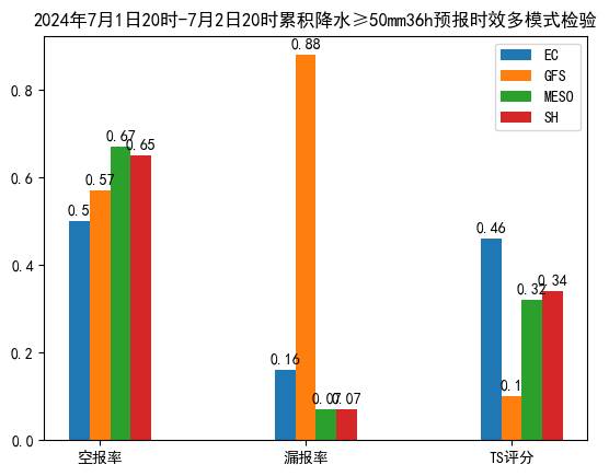 Figure 9. The traditional multi-model verification results for 48 h (a, c) and 36 h (b, d) forecast lead times of cumulative precipitation ≥ 50 mm (from 20:00 CST on July 1st to 20:00 CST on July 2nd) over the Shandong Peninsula region