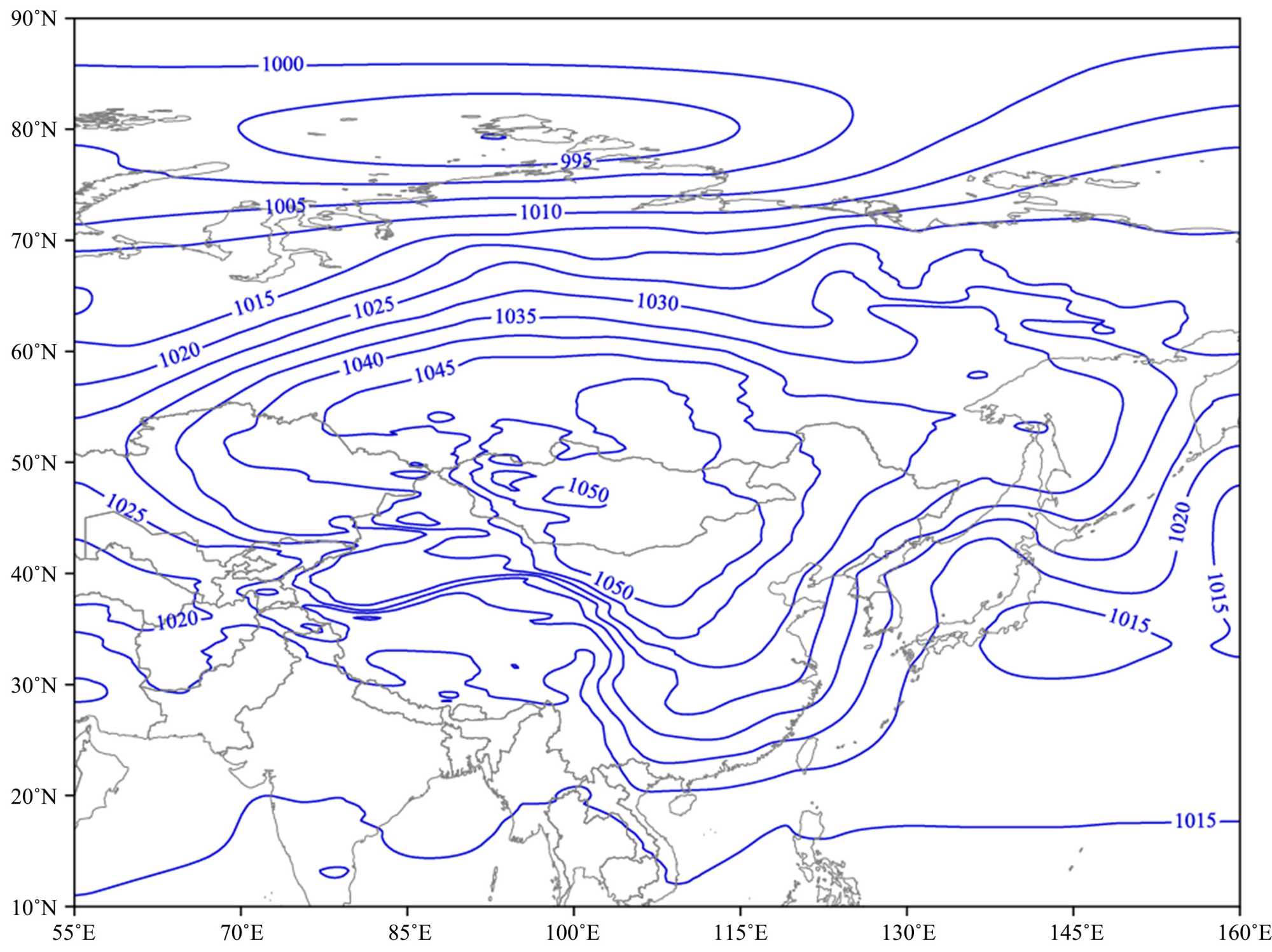 图2. 3次过程海平面平均气压场:(a) 过程I、(b) 过程II、(c) 过程III