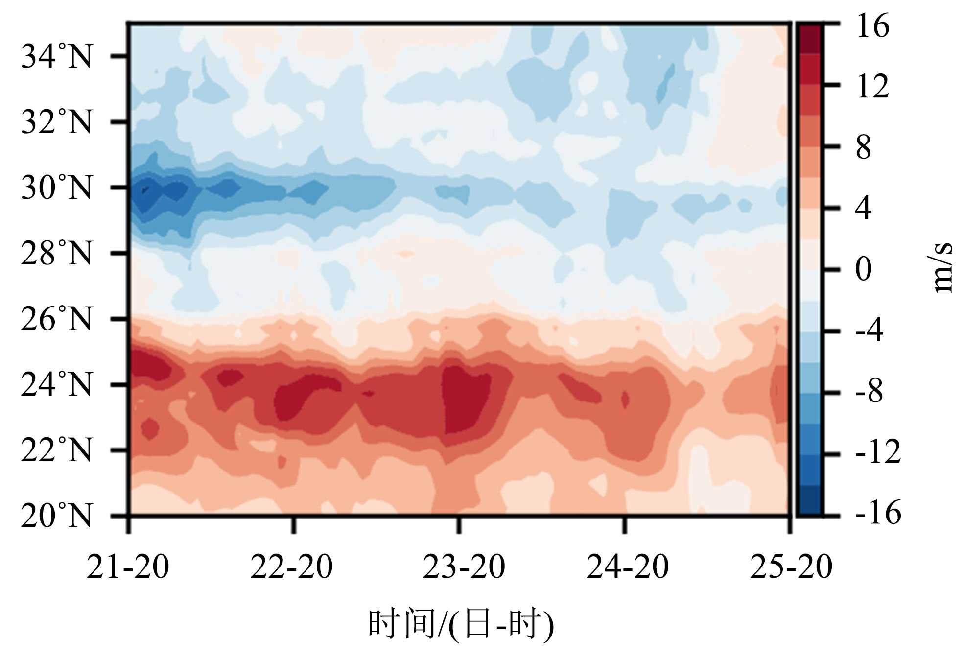 图3. 3次过程850 hPa经向风(单位m·s−1)沿111˚E的时间剖面:(a) 过程I、(b) 过程II、(c) 过程III