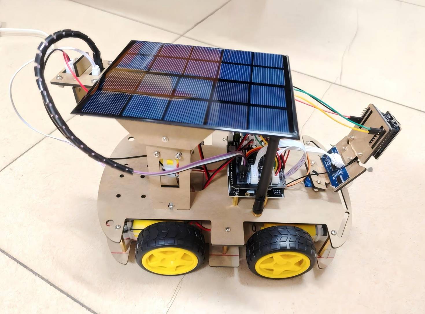 以“基于机器视觉技术的太阳能驱动嵌入式小车”项目为例,该项目要求学生完成从需求分析到系统部署的全流程开发:(1) 需求定义:实现小车对光照强度的自适应追踪(最大化太阳能利用率)与障碍物自主避障;(2) 技术方案:硬件层面采用STM32H743微控制器作为核心,搭载光照传感器(BH1750)、摄像头模块(OV7670)及太阳能电池板(12V/5W);算法层面通过ResNet-18轻量化模型(经模型剪枝后参数量减少60%)实现障碍物识别,采用PID算法动态调整小车转向与光照追踪角度;(3) 实施过程:学生需解决“资源受限环境下的算法效率”问题——通过将模型量化为INT8精度,使推理速度提升至30fps,满足实时性要求;(4) 成果评估:项目验收显示,85%的学生能独立完成系统集成,70%的学生实现算法优化(较初始方案能耗降低25%)。如下图5所示基于机器视觉技术太阳能驱动嵌入式小车设计真实案例,强化学生对AI融合新能源技术赋能嵌入式实践项目落地的理解。这些改革旨在培养具备“AI算法应用 + 新能源技术理解 + 嵌入式系统开发”复合能力的工程技术人才[9]。