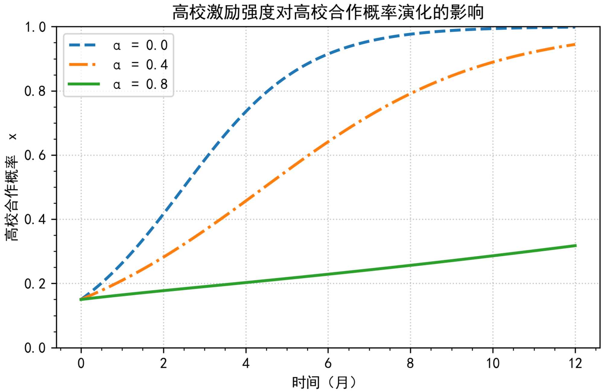 分别为0 (无激励)、0.4 (适度激励)与0.8 (较强激励)三种情形进行演化分析,并通过Python绘制高校合作概率