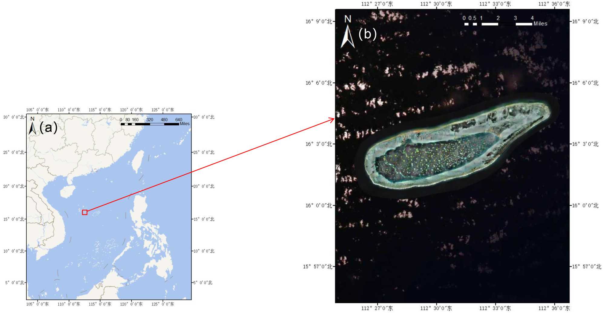 基于此,本文以南海浪花礁为研究区域,选用Landsat-8 OLI影像作为遥感数据源,结合ICESat-2激光测高数据作为实测水深参考,采用对数比值模型建立水深反演模型,并对其反演精度进行验证和评估。研究旨在探索在高空间分辨率遥感影像支持下,如何提升浅水区域水深反演的精度和稳定性,从而为海洋地形测绘与生态环境研究提供实用技术支撑。