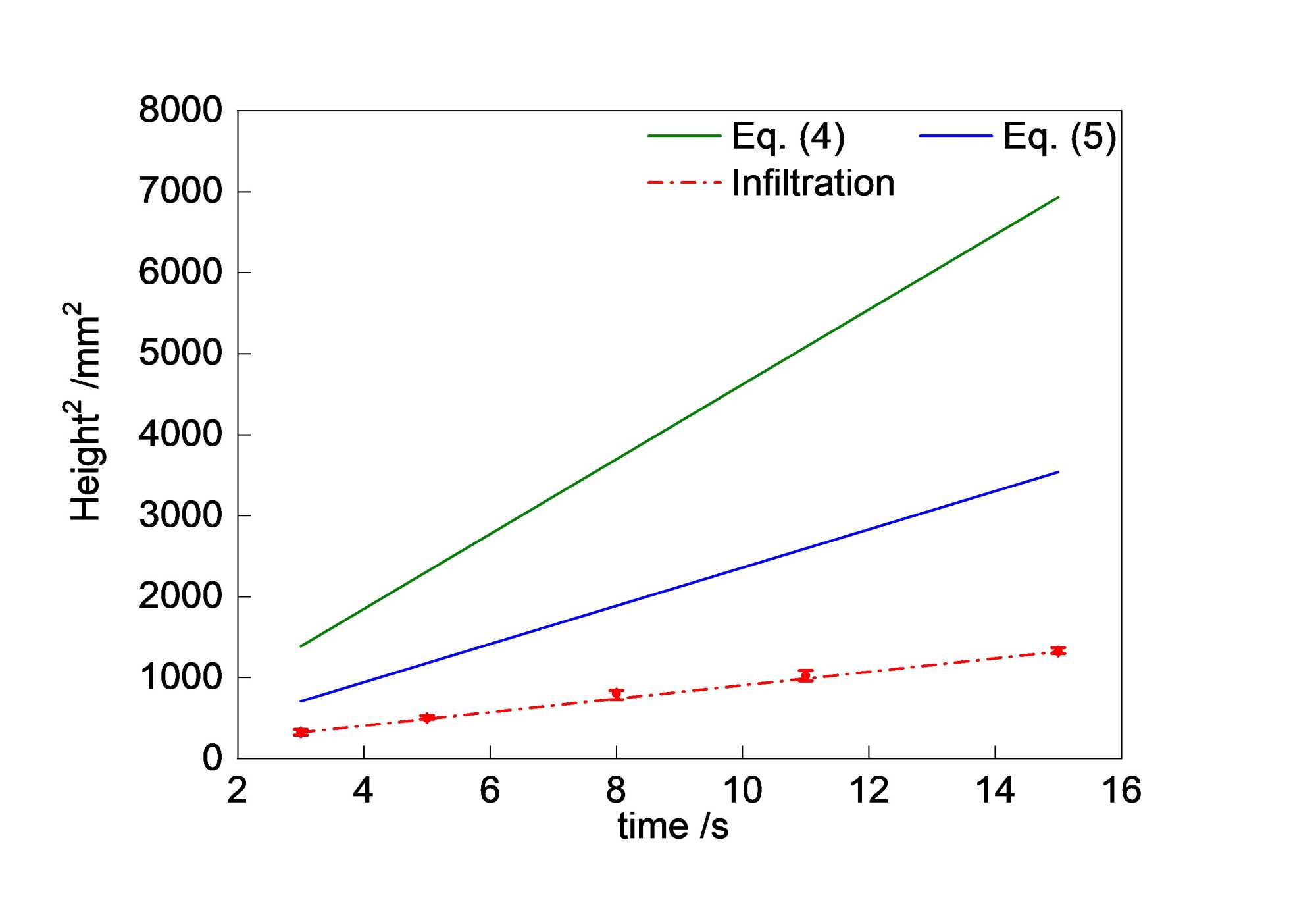 图9. 通过实验和式(6)计算得到的浸渗压力为400 kPa时Si预制体浸渗高度