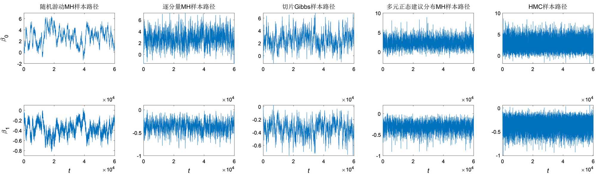 现有贝叶斯统计教材(如文献[8] [9])在讨论后验分布计算时,大多主要以Metropolis-Hastings系列算法为代表介绍MCMC采样算法,例如Gibbs采样等。但正如前面所讨论的,这些方法虽然理论性质较好,但计算代价较大。此外,从实践上看,MH系列算法在一些情况下的收敛性质并不理想。因此,有必要在教学中引入新近发展起来的,计算效果更好的采样算法。