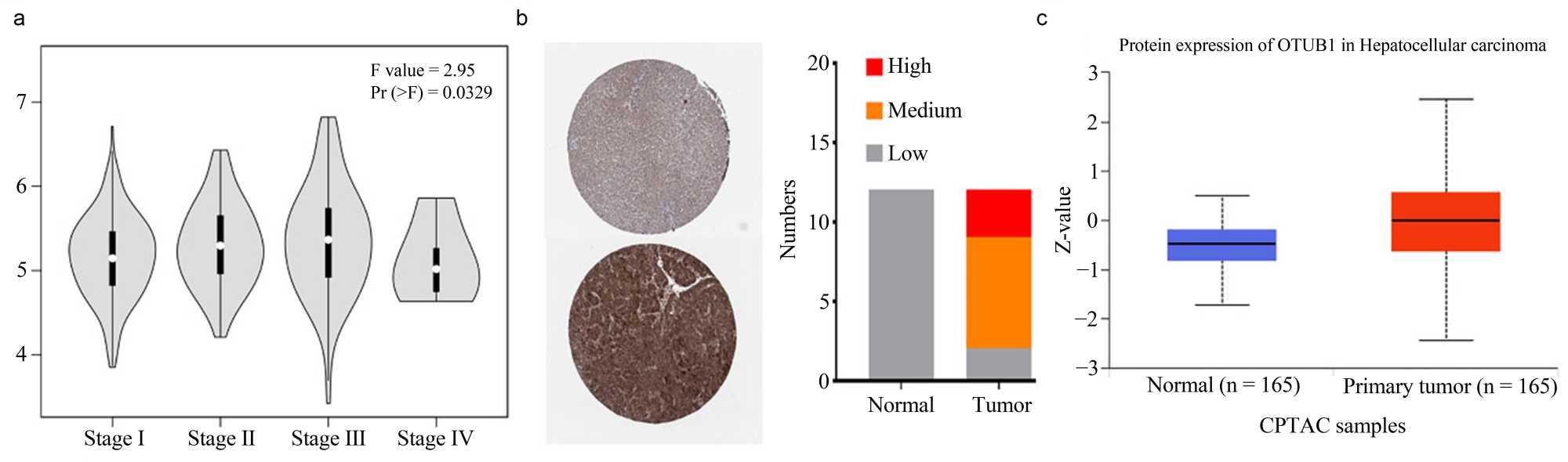 图5. OTUB1表达与肝癌进展相关性分析。(a) OTUB1表达与肝癌病理分期的相关性;(b), (c) OTUB1蛋白在肝癌及癌旁组织中的表达