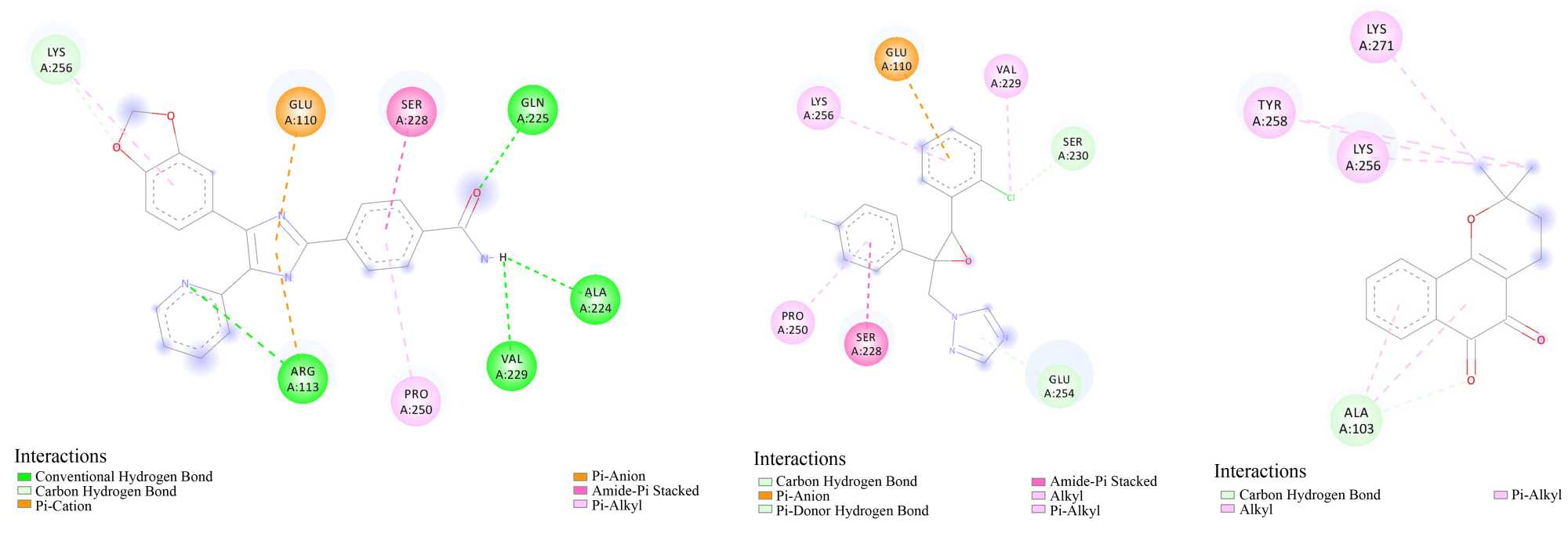 我们随后通过分子对接进一步分析了10个化合物与OTUB1蛋白的相互作用(图8)。结果显示:4-(5-benzo(1,3)dioxol-5-yl-4-pyridin-2-yl-1H-imidazol-2-yl)benzamide、beta-lapachone和epoxiconazole均与OTUB1蛋白具有良好的对接活性,其中4-(5-benzo(1,3)dioxol-5-yl-4-pyridin-2-yl-1H-imidazol-2-yl)benzamide与OTUB1蛋白的结合能最低,对接活性最好(图9)。