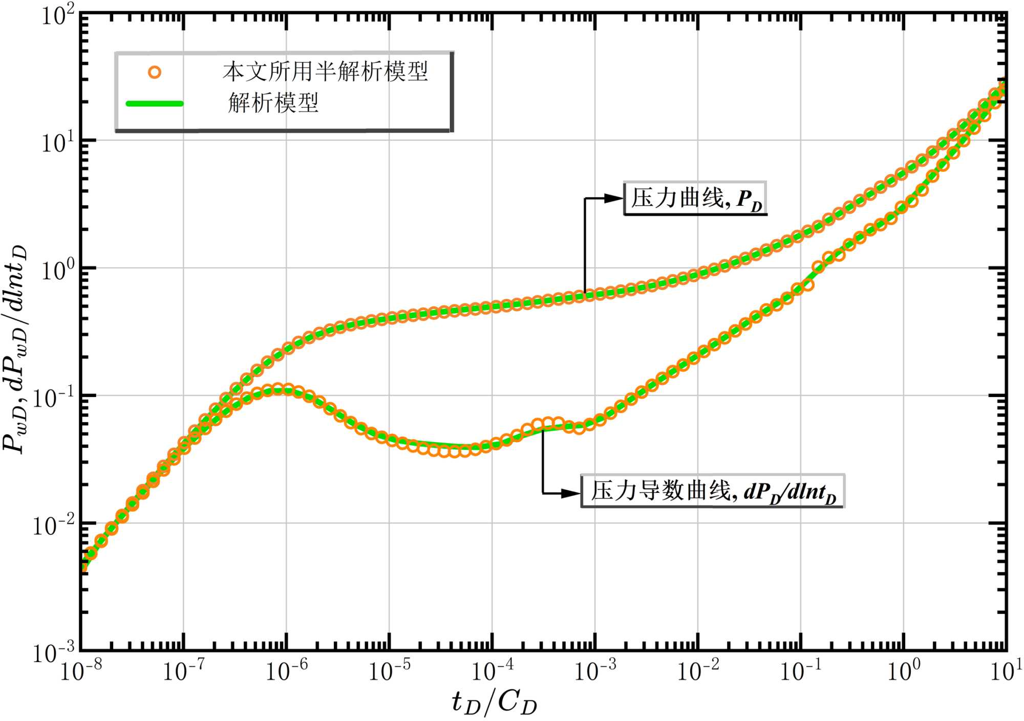 图3. 本文模型与解析解的无量纲压力及压力导数曲线对比
