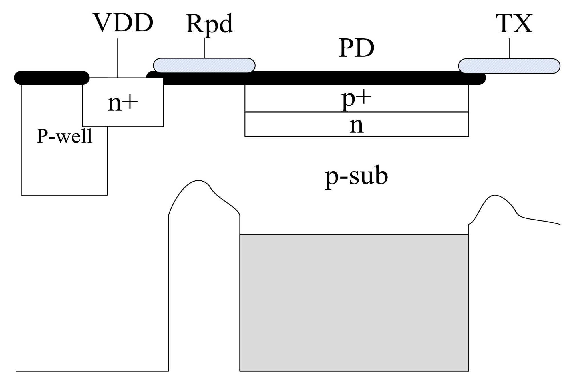 在5T像素中,像素的曝光受Rpd的栅极电压决定,像素能积累的最大满阱电荷由Rpd管的势垒决定。本文通过增加Rpd的电源管理模块,对Rpd在不同时间段的势垒进行分段控制,在分段曝光的不同阶段对饱和的大信号进行多余信号泄放,抑制信号饱和。