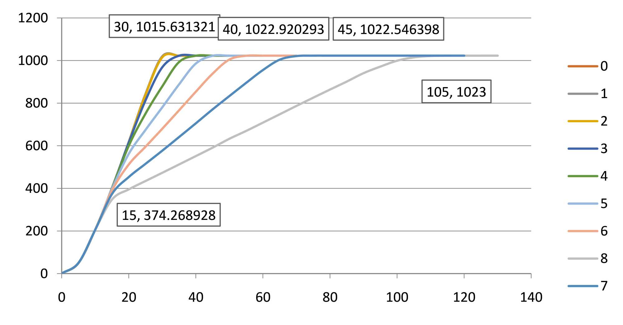 从图中可以看到,在所有曲线中,在光强小于15 (输出值小于374),输出信号完全重合,可以认为在不同分段曝光情况下,光强小于15的小信号不受中间势垒影响,实际曝光时间就是整个曝光时间。