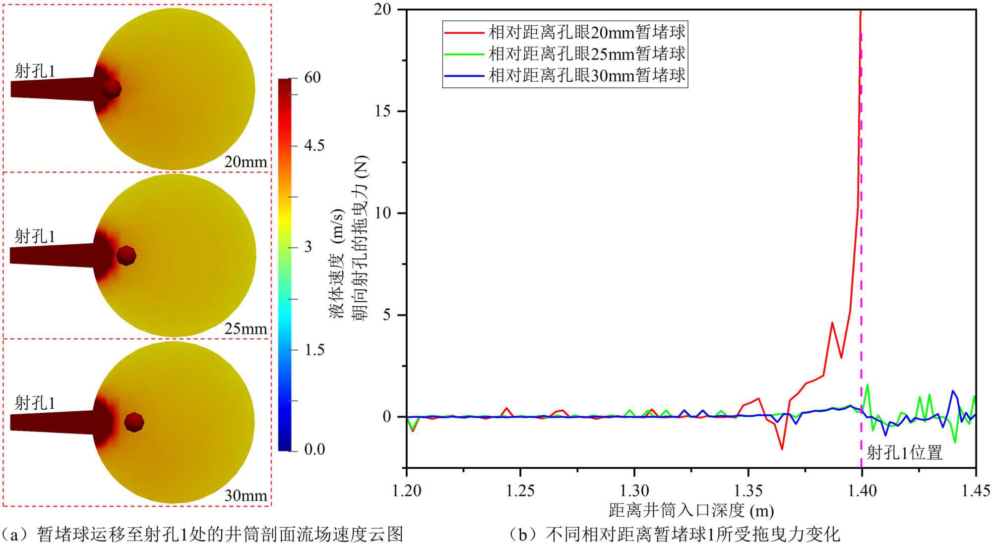 如图3所示,统计了暂堵球在与孔眼不同相对距离投放下的封堵率,随着距离增大,封堵效率逐渐降低。孔眼附近存在一个高速流体区域,当暂堵球进入射孔簇范围内,其与射孔的距离是决定其能否受到孔眼分流对其轨迹影响的关键因素。如图4(a)提取了三种相对距离下暂堵球在与射孔1同一水平面时周围的流场云图,可见其与孔眼的初始相对距离越近,在下降至孔眼附近就会越靠近其射孔分流的高速流体范围中心,受到朝向孔眼拖曳力的影响更大。如图4(b)是三种相对距离下球1在射孔1附近所受到的朝向孔眼的拖曳力变化,小球在下降至孔眼附近时所受到的拖曳力逐步上升,其中初始位置相对距离孔眼20 mm的小球在靠近孔眼时所受到的拖曳力增幅最大,成功坐封孔眼;相对距离孔眼30 mm的小球在下降至和射孔1同一水平面几乎没有受到朝向射孔的拖曳力,因而未能转向孔眼。