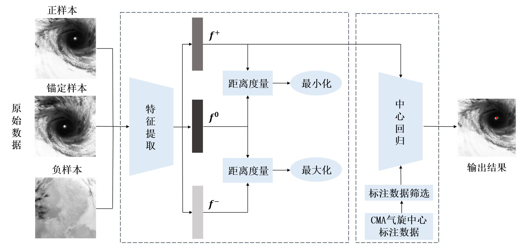 随着深度学习在计算机视觉领域的快速发展,目标检测等图像处理任务的性能显著提高[7] [8],研究者基于卫星云图广泛使用深度学习提取热带气旋特征和定位气旋中心。如2019年,Duan等人[9]提出了CenterNet模型将目标检测视为标准关键点估计问题,首先使用输入图像通过全卷积网络生成热图,然后将热图的峰值位置视为物体的中心,并使用峰值周围的图像特征来确定划定物体的边界框的宽度和高度;2020年,Tan等人[10]结合残差结构和注意力机制来检测目标,还在给定约束条件下,对卷积网络的深度、宽度和分辨率进行缩放,提高了模型效率;2024年,郑宗生等人[11]提出一种融合通道注意力与坐标注意力的卷积神经网络模型(TY-LOCNet)进行台风中心定位,并提出距离损失函数通过距离回归提高模型定位精度。深度学习方法的优势在于不需要人工设计特征提取器,而是利用其强大的非线性表达能力自动从复杂的图像分布中提取出高层特征[12]。现有的基于深度学习的热带气旋中心定位方法主要通过监督学习的方式直接从已有的标注数据中学习模型参数,需要大量标签信息,标注成本高,且方法仅限用于热带气旋中心定位。为了在仅有少量可靠的气旋中心标注数据的条件下有效地学习气旋的结构特征,一种常用的思路是采用无监督学习和有监督学习相结合的方式,即所谓的半监督学习[13]。而能否有效提取特征的关键在于无监督学习方法的选择。当前无监督学习的主流方法包括生成式模型和自监督学习方法等,其中自监督学习方法主要分为“对比式”和“生成式”两类[14]。生成式模型旨在对数据的分布进行建模,利用该分布可以产生出新的样本[15] [16]。常见的生成式模型包括自编码器、生成对抗网络等[17]。其中生成对抗网络通过对抗训练的方式来不断提高生成样本的质量[17] [18]。但生成对抗网络的训练依赖大量的样本,并且训练过程不稳定,很容易出现模式崩溃的现象[19]。考虑到对于热带气旋中心定位任务更多的是关注热带气旋中心及周边区域天气系统的特征,因此定位模型需要更侧重于学习具有判别属性的特征。而对比自监督学习则是一种可根据具体任务生成伪标签,并利用特定的距离度量函数来学习任务有关的特征的方法[16] [20]。对于气旋中心识别和定位任务来说,可构造热带气旋系统的正负样本对,并利用距离度量函数使模型能够有效学习到气旋系统相对于非气旋系统的判别性特征。