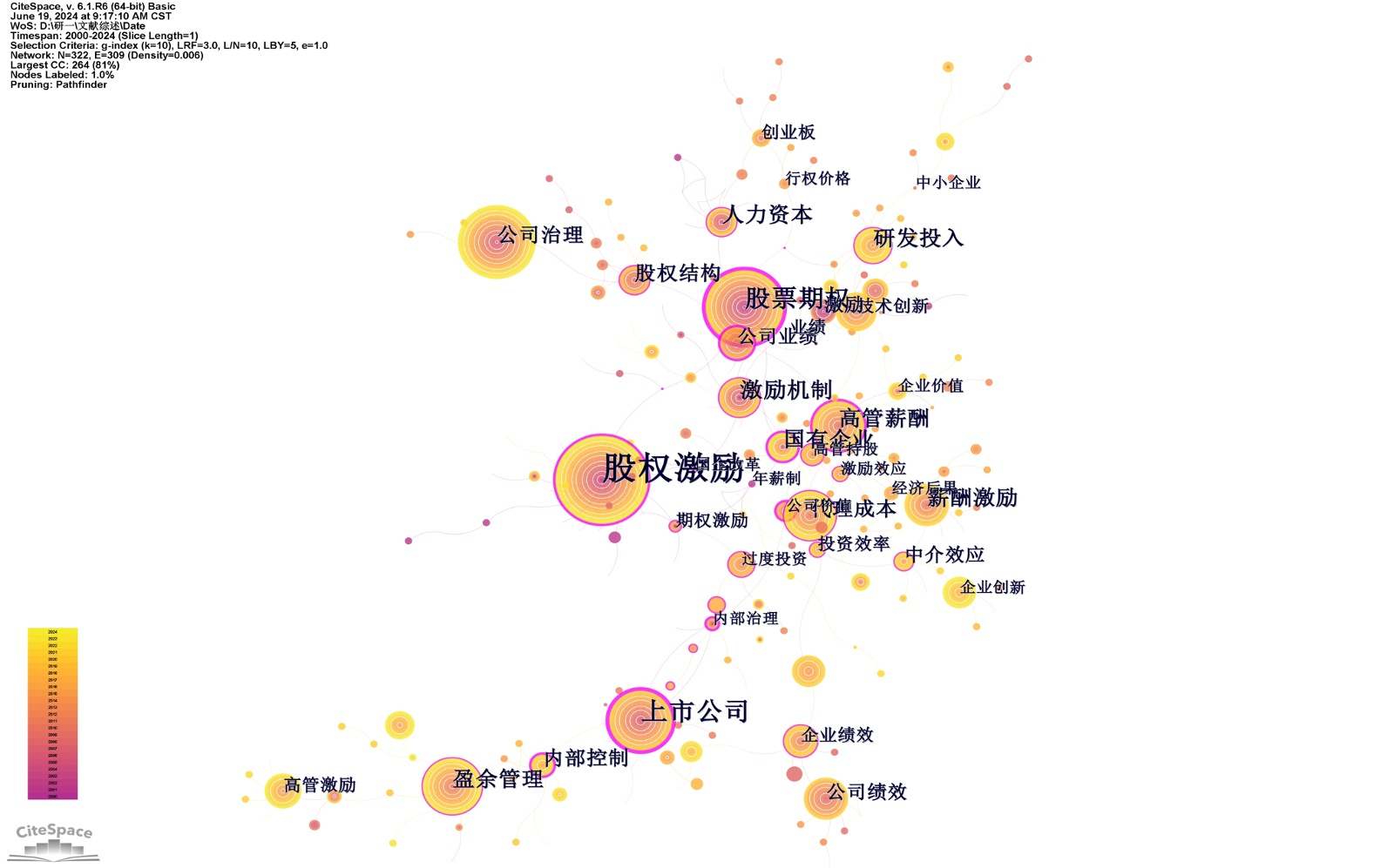 关键词是论文主题的核心,其出现的频次和关联关系能揭示某一研究领域的前沿热点。本文运用CiteSpace软件绘制高频关键词共现图谱,图中的节点以圆形展示,由内到外显示不同颜色,表示时间跨度从2000~2024年,节点越大,说明关键词出现频次越高,影响力也越大。图谱共生成N = 322个节点,E = 309条连线,代表着1793篇有效文献中共有322个不同的关键词出现,构成关联性连线309条。密度D = 0.006 < 0.1,说明该领域的研究集中化程度较低,尚未形成紧密的知识簇团。由图1可知,目前国内股权激励研究所涉领域较为广泛,但总体是基于上市公司股权激励对企业绩效的影响。