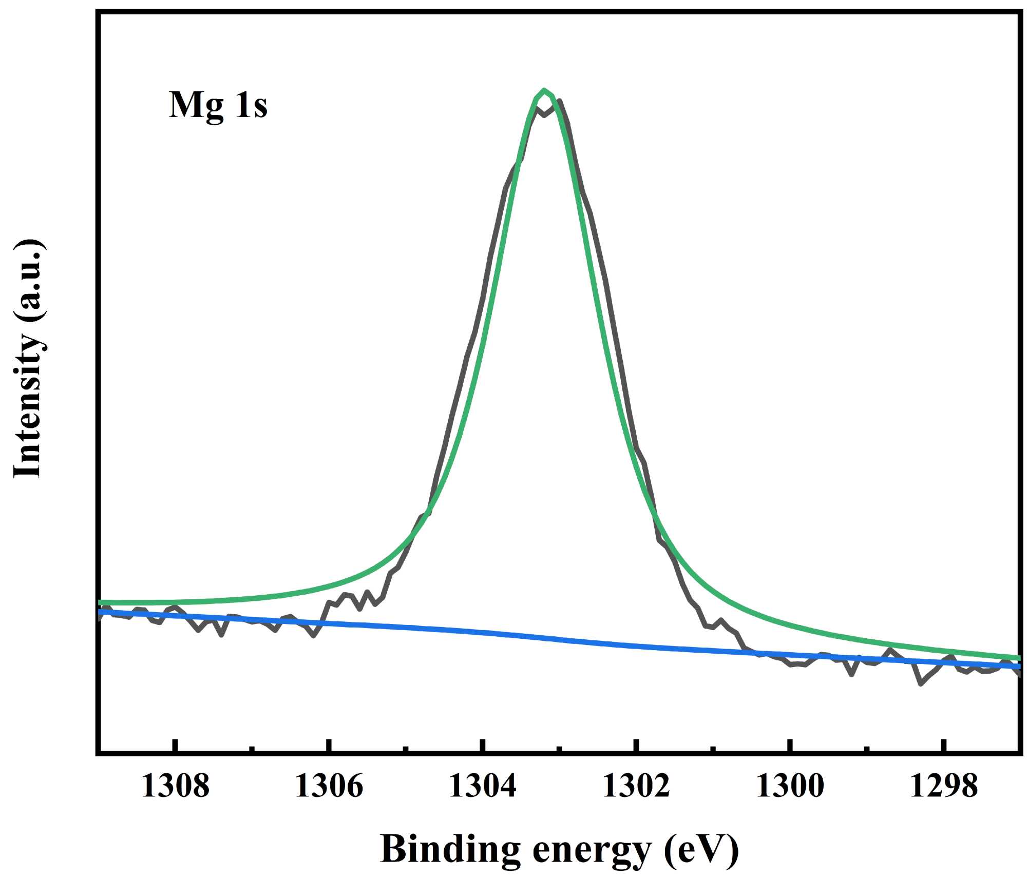 为了进一步确定ZnFe2O4@Sepiolite样品的化学成分,采用XPS对ZnFe2O4@Sepiolite样品的表面化学状态进行表征。XPS全谱图3(a)清楚地显示ZnFe2O4@Sepiolite样品中存在O、Si、Mg、Zn和Fe元素。图3(b) O 1s特征峰位于526.6 eV处,通过Avantage软件拟合,可以将其分为526.6 eV和528.3 eV处的两个峰,分别对应晶格氧和H2O中氧的结合能。图3(c) Si 2p光谱显示了Si氧化物(101.8 eV)、铝硅酸盐(102.7 eV)和有机Si (103.6 eV)的存在。图3(d) Mg 1s光谱显示了一个镁硅酸盐的结合峰。图3(e)结合能在1021.1 eV和1044.3 eV处有明显的结合能峰,对应于Zn 2p 3/2和Zn 2p 1/2轨道,即样品中Zn离子以Zn2+的形式存在。图3(f) Fe 2p结合能为712.4 eV (Fe 2p3/2)和725.2 eV (Fe 2p1/2)的主峰及其卫星峰(719.0 eV和733.1 eV)为Fe3⁺的典型特征,证实ZnFe2O4的尖晶石结构在负载后未发生改变。Fe3⁺作为PMS活化的活性位点,为催化降解提供了基础。综上所述,XPS测试结果表明ZnFe2O4成功负载到海泡石纤维上。ZnFe2O4颗粒与海泡石之间形成了化学键,更有利于提高复合材料的结构稳定性。