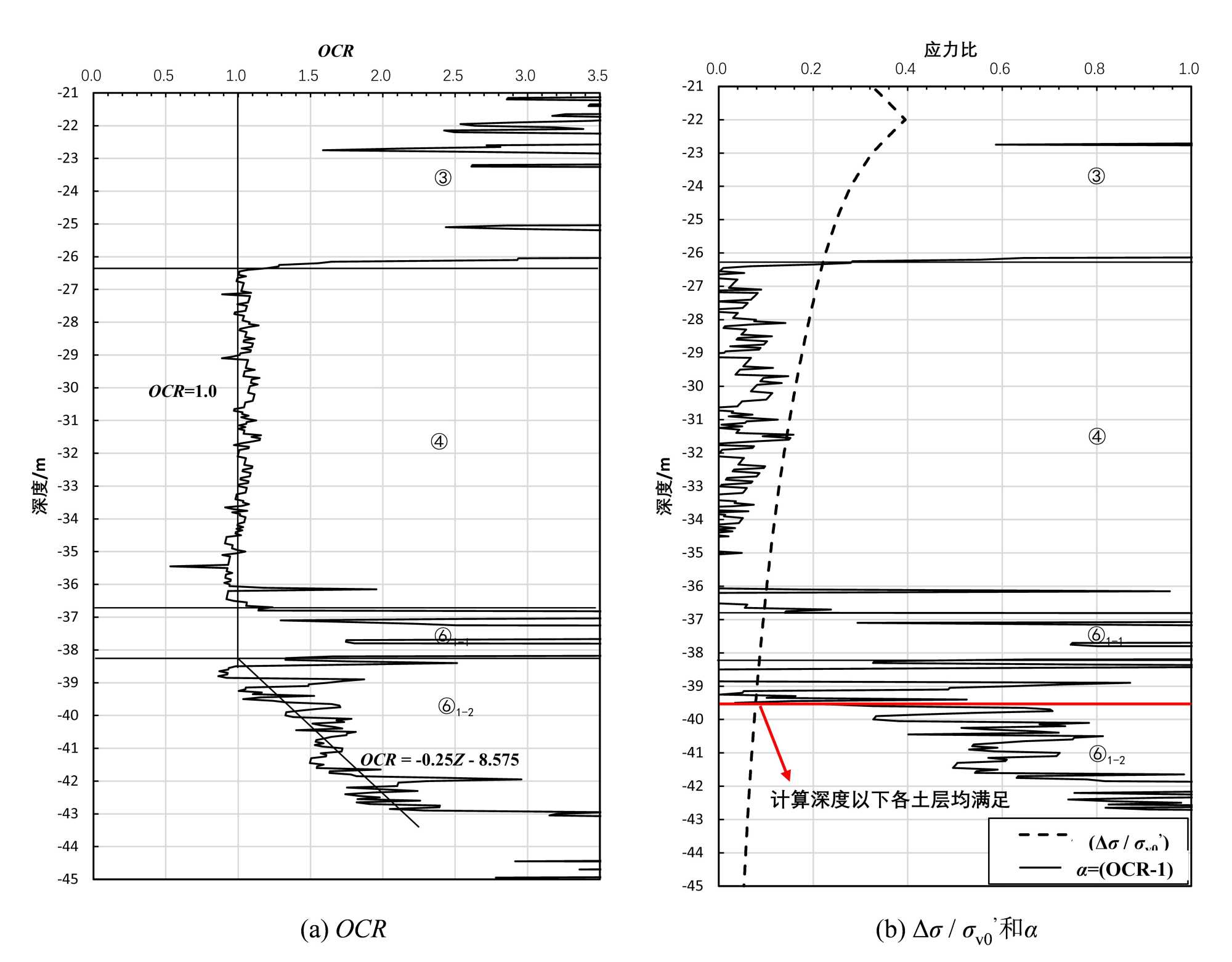 4) 根据土层OCR确定应力比α以及压缩层厚度,若OCR > 1 (结构性土),按应力比法取α = OCR − 1;若OCR = 1 (正常固结土),计算到该层土底部;若OCR < 1 (欠固结土),沉降计算时不仅计算到该层土的底部,同时还要考虑自重固结导致的沉降。