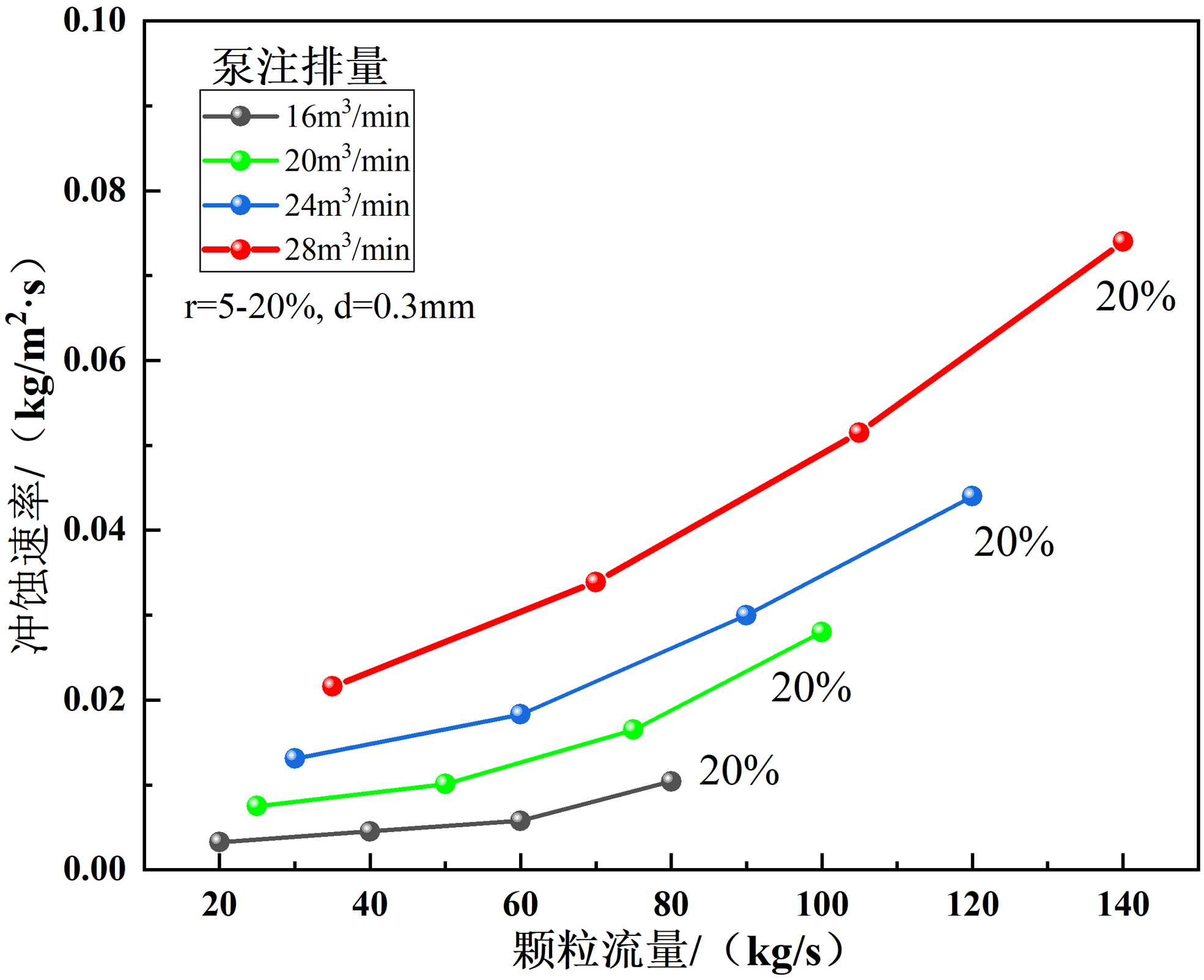冲蚀速率定义为在单位时间内、单位面积上材料损失的质量,用于量化侵蚀的严重程度。该速率受多个操作与物性参数的影响,其中颗粒的冲击速度、质量流量及粒径是主要影响因素。冲蚀速率的计算可通过以下模型表达: